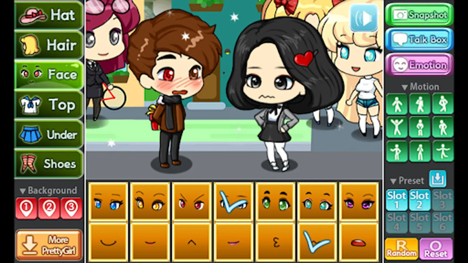 You can create your own Pretty Girl comics by using various emotion display and dialogue,