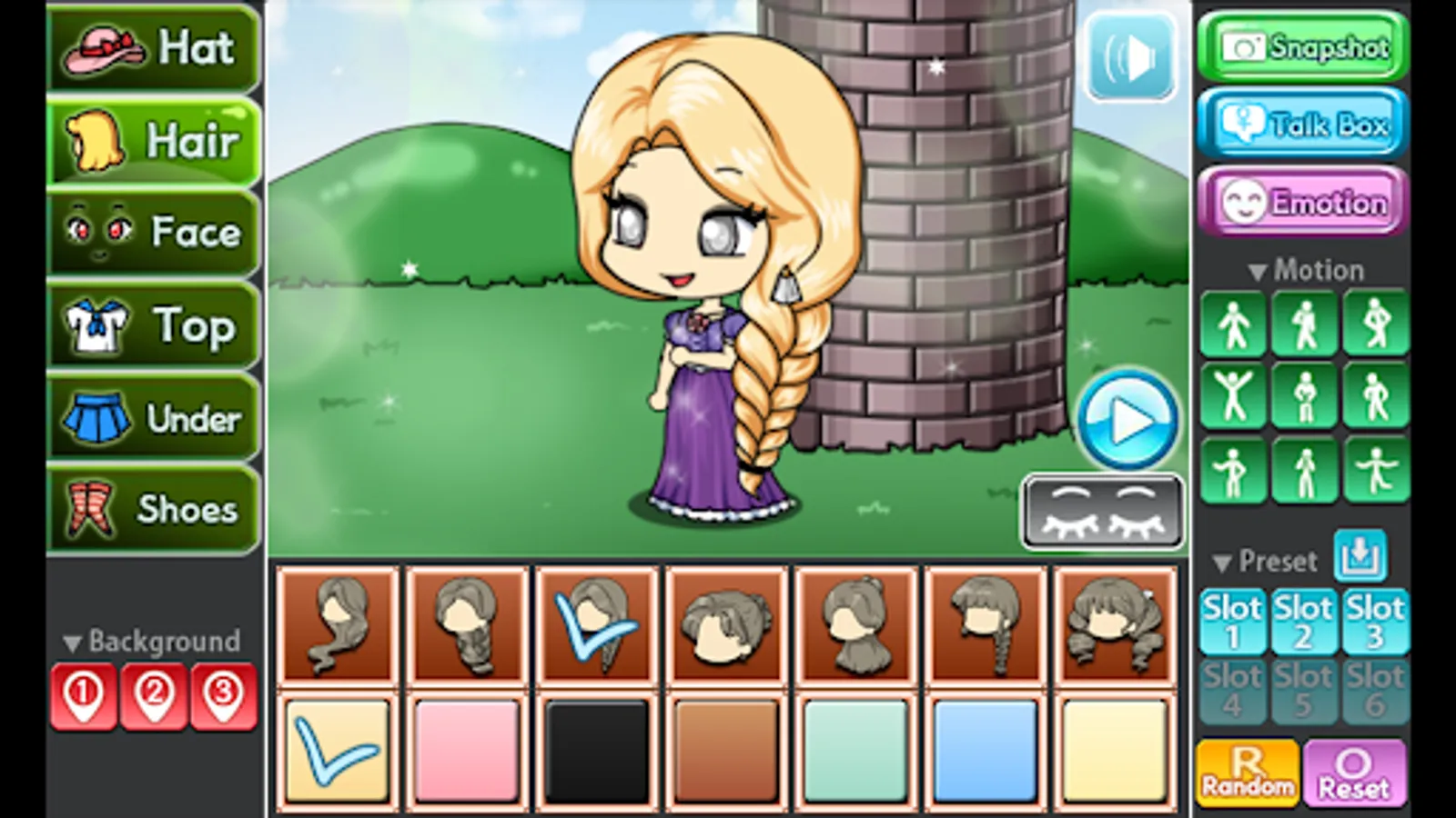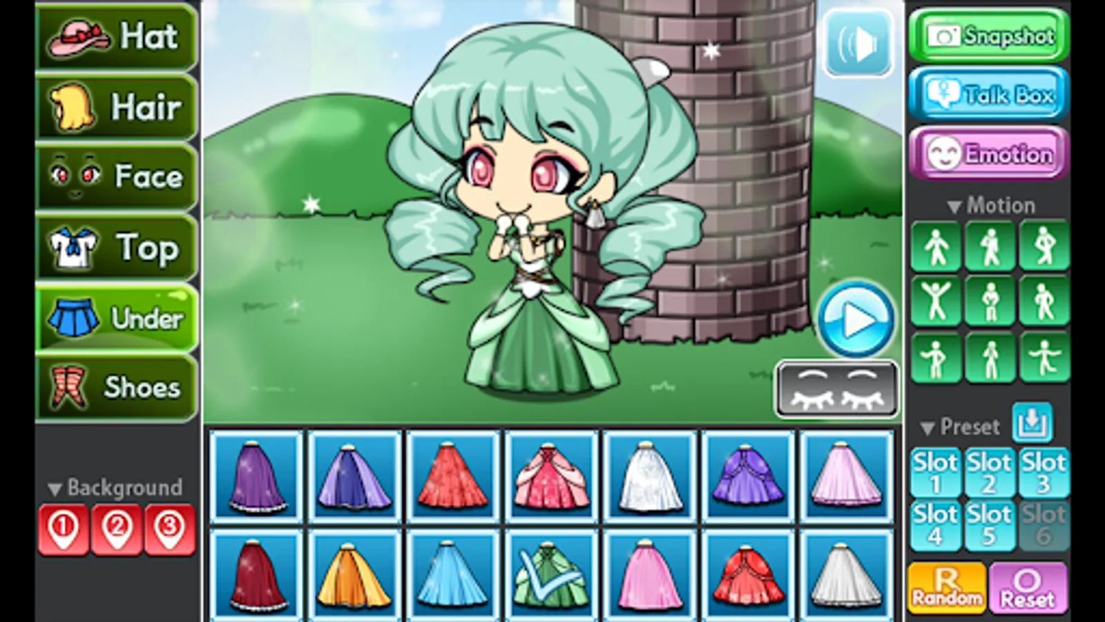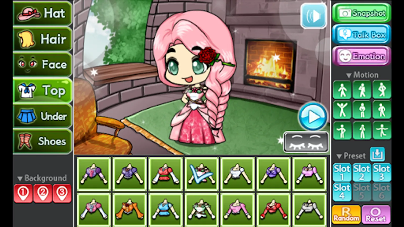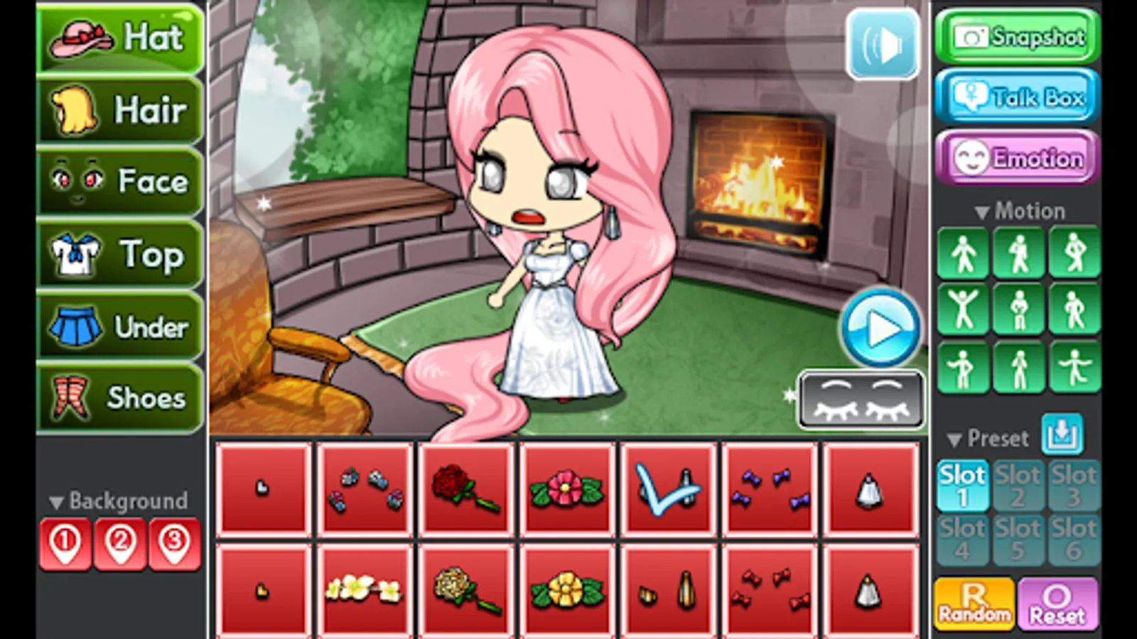 You can change the background, 9 poses and motions, you can also store your Pretty Girl in 6 slots.
