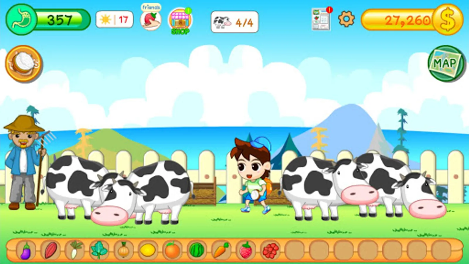 The game is a vegetable style familiar but change to lateral view and do activities such as digging, seeding, watering. There are animals such as cows, sheep and chickens and bring the products to market, sell them and buy upgrades.