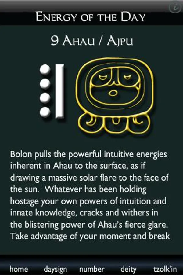Typically, other Mayan Calendar apps define the Tzolkin’s twenty day signs and the thirteen numbers individually, and use those descriptions in place of the daily energies, which is not the way the Mayan Calendar was meant to be practiced. To our knowledge there are no compilations of the 260 daily energies that integrate the meaning of each day sign with the meaning of the number that accompanies it. This is critical, for the numbers do in fact influence the day signs, and change the energy and power of each specific day—for example, 2 Lamat is not the same as 11 Lamat.