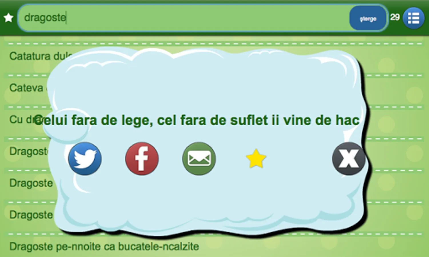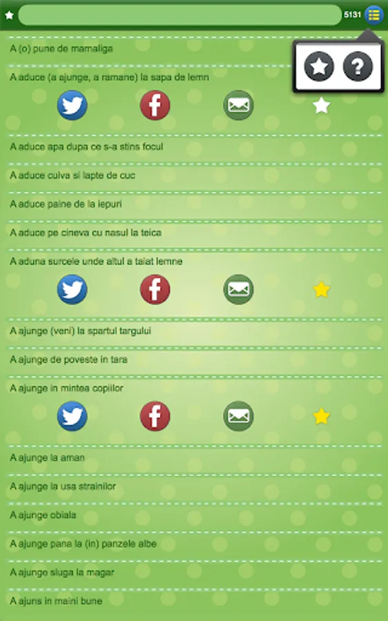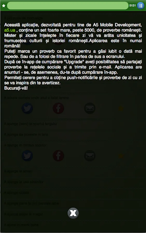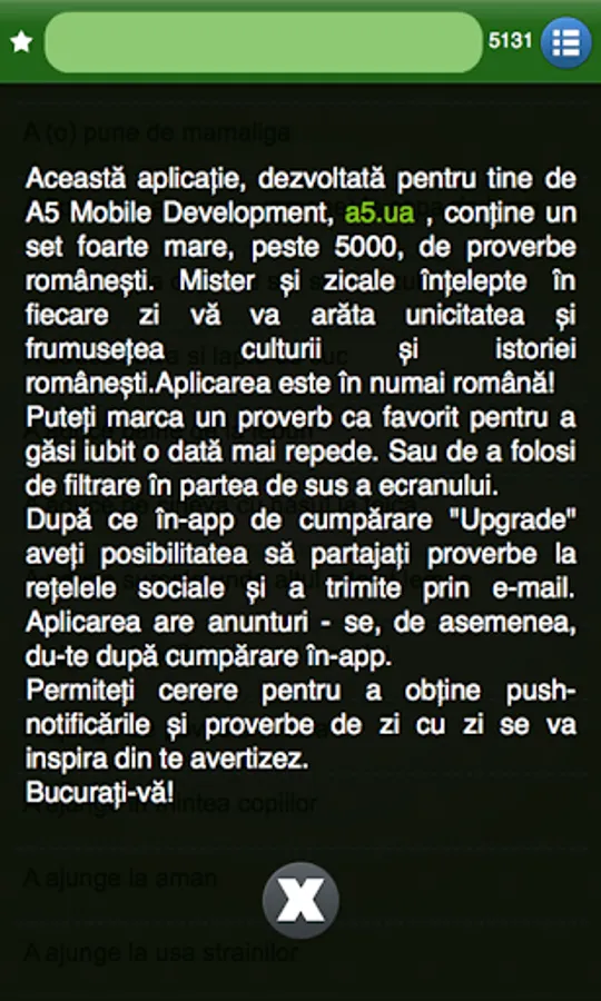 This application, developed for you by A5 Mobile Development, contains the huge set, over 5000, of Romanian proverbs. Mystery and wise sayings on every day will show you the uniqueness and beauty of Romanian culture and history.