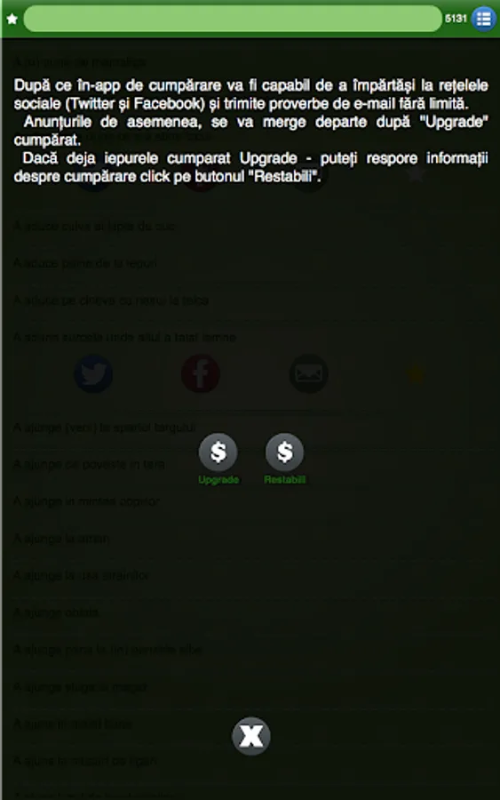 After in-app purchase "Upgrade" you can share proverbs to social networks and send via email. Application has ads - it also go away after in-app purchase.