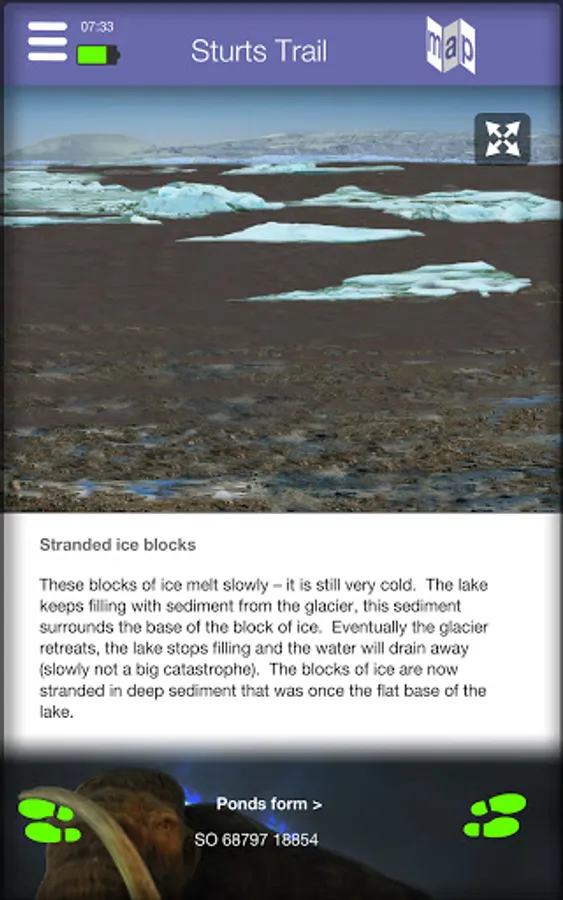 The app includes a glossary of words relating to glacial features, along with detailed explanation of how the ponds formed.