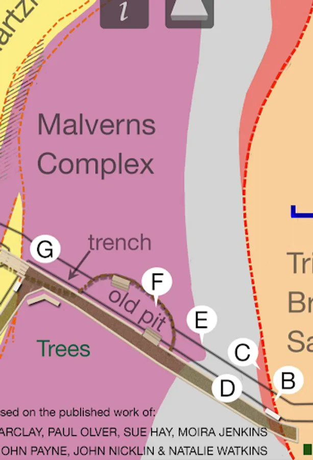 2D map of geology and trails from Abberley to The Talbot, with photo hot spots and cross-section.