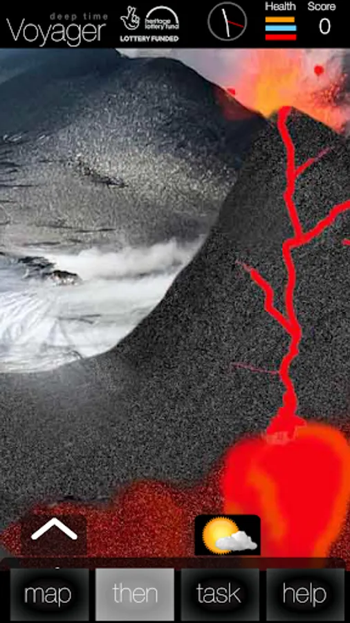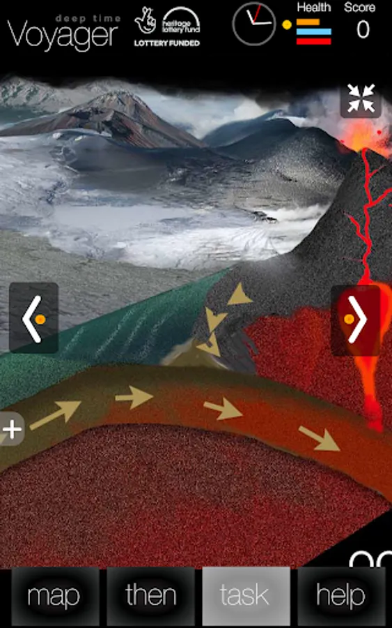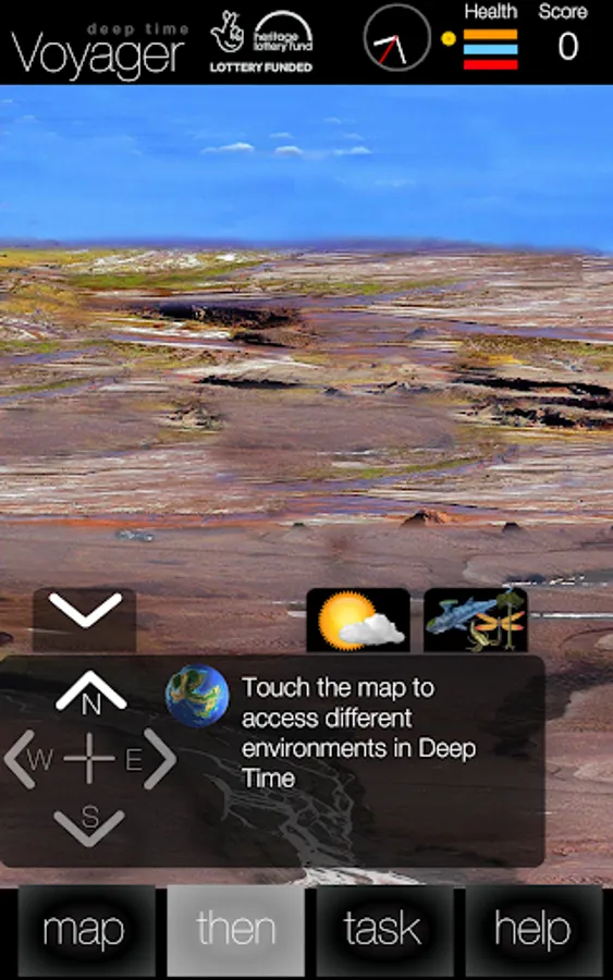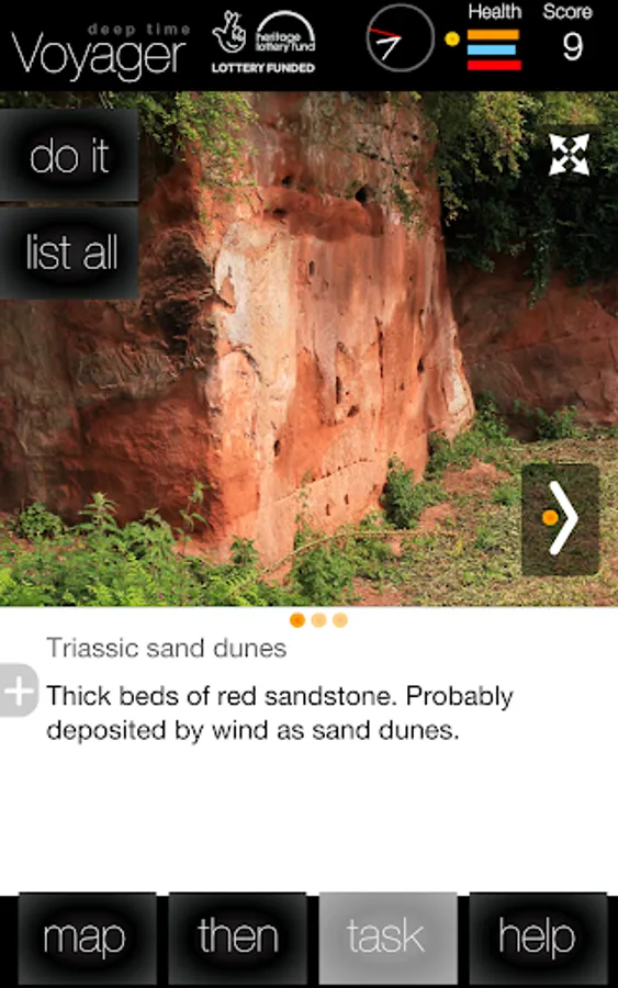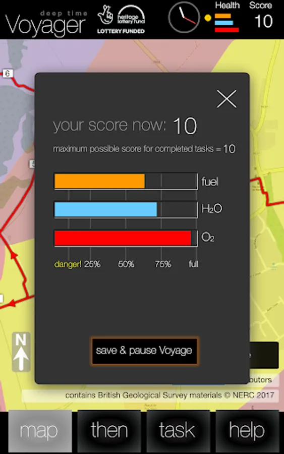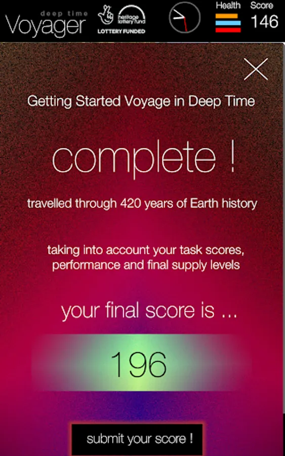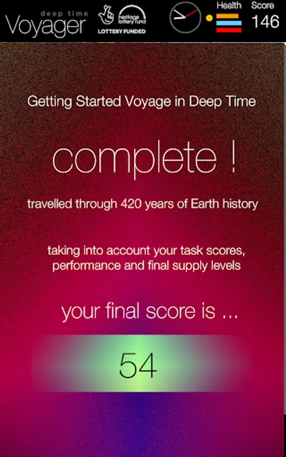 Take one of the walks (Voyages into deep time) - more to download soon - and try to survive in the planets past environments by building a leading score. Your score is built by answering tasks, dealing with unpredictable threats and maintaining virtual supplies of oxygen and water. Your fuel is your devices battery charge.