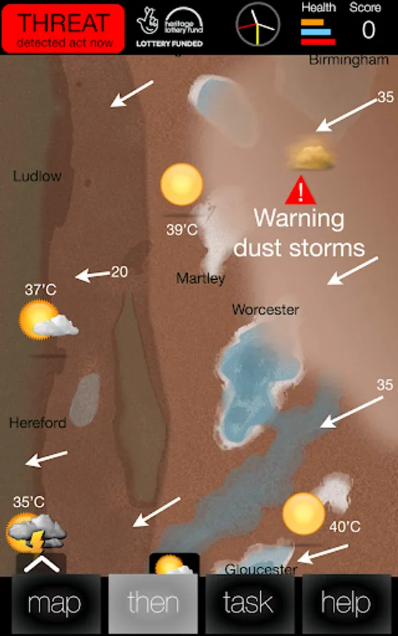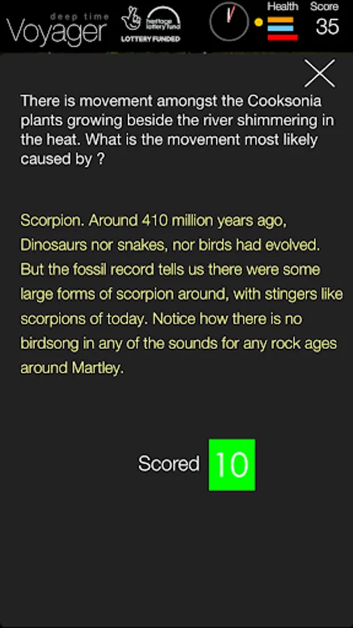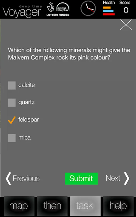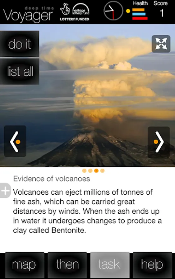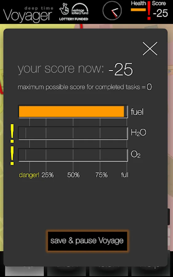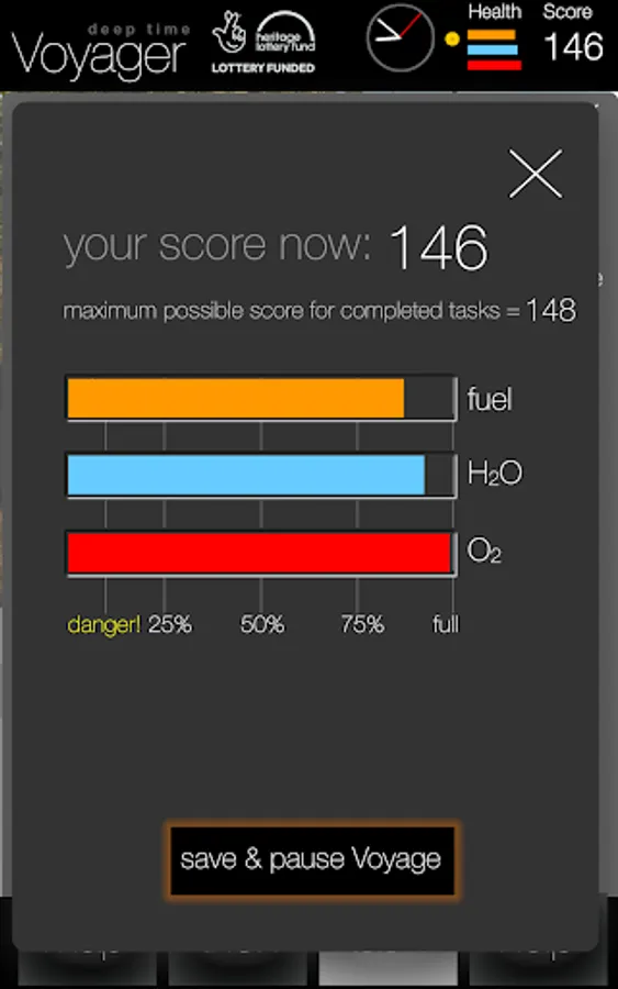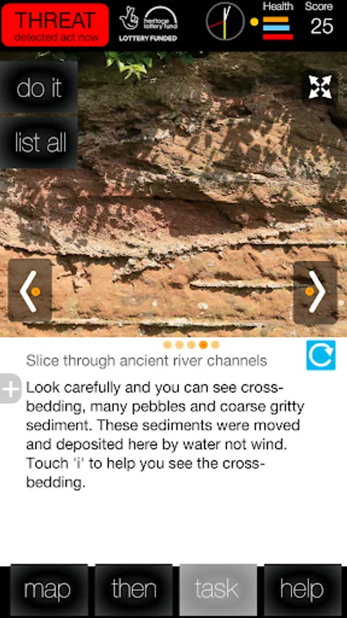 Take one of the walks (Voyages into deep time) - more to download soon - and try to survive in the planets past environments by building a leading score. Your score is built by answering tasks, dealing with unpredictable threats and maintaining virtual supplies of oxygen and water. Your fuel is your devices battery charge.