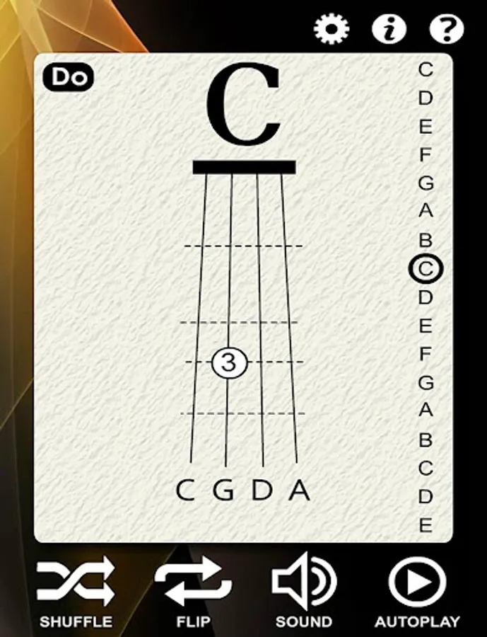 The front side of the card displays the note on the music staff, and the back side displays what note it is and where to play it on the fingerboard.