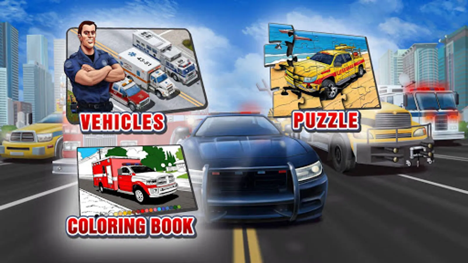 Interactive emergency vehicles for kids! Peekaboo style educational app for toddlers and preschool kids.