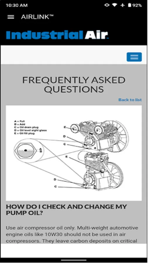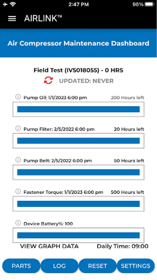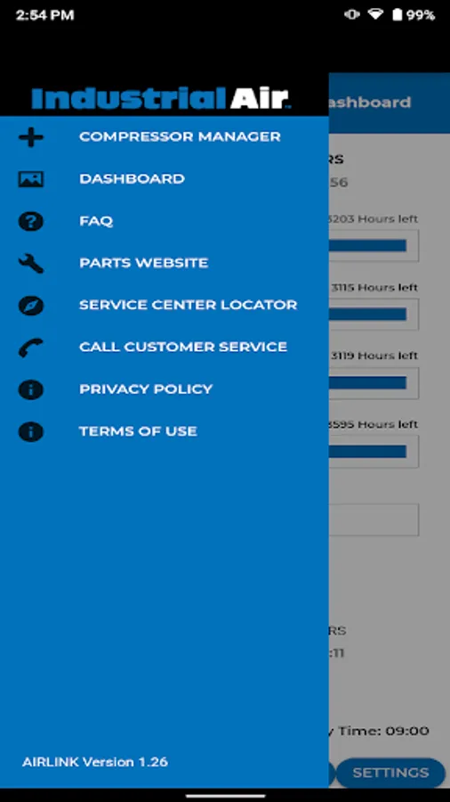 The Industrial Air AirLink system tracks your air compressor's runtime, energy usage and maintenance activities. Through the app you will be able to find service centers, repair parts and view FAQ's about your air compressor. The app will remind you of key maintenance activities as they come due so you can keep your air compressor running at peak efficiency and extend it's life.