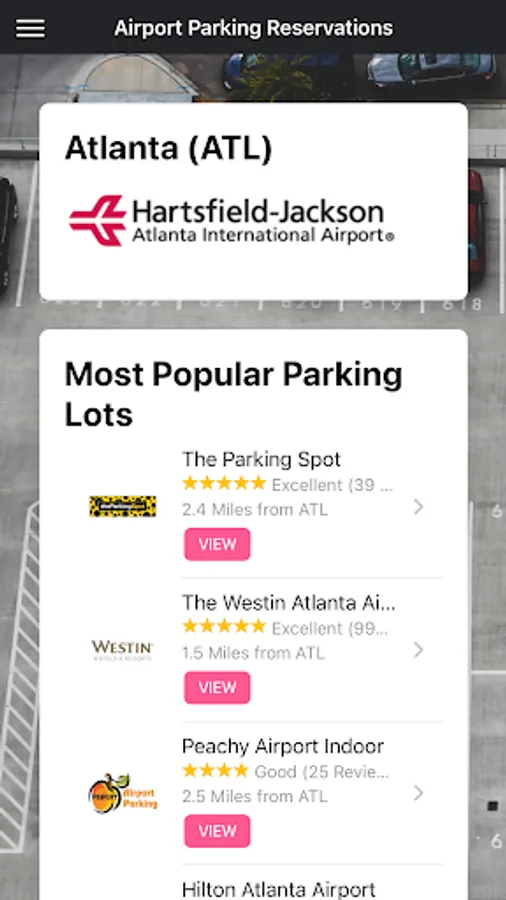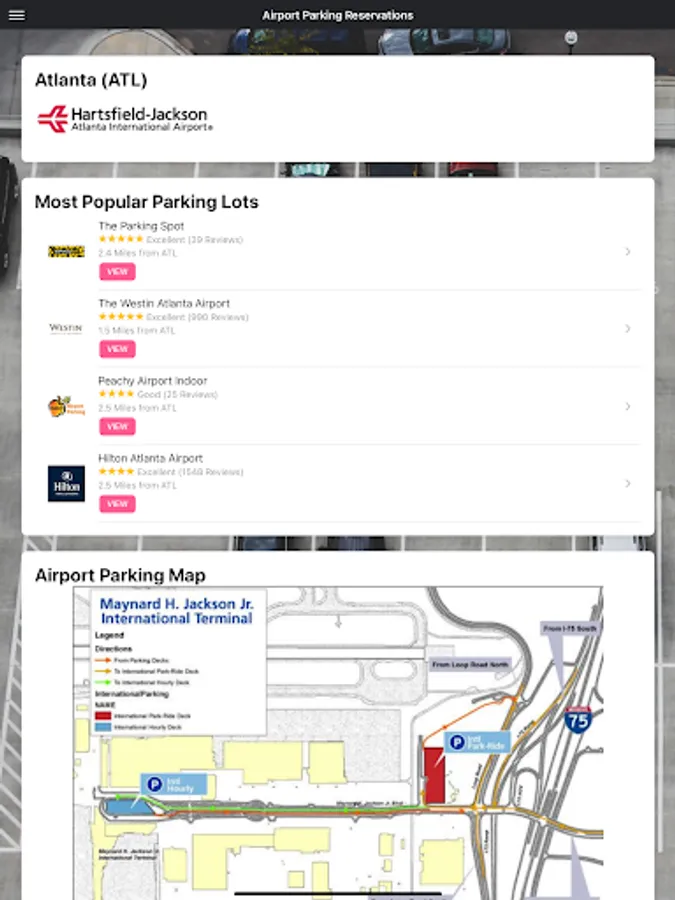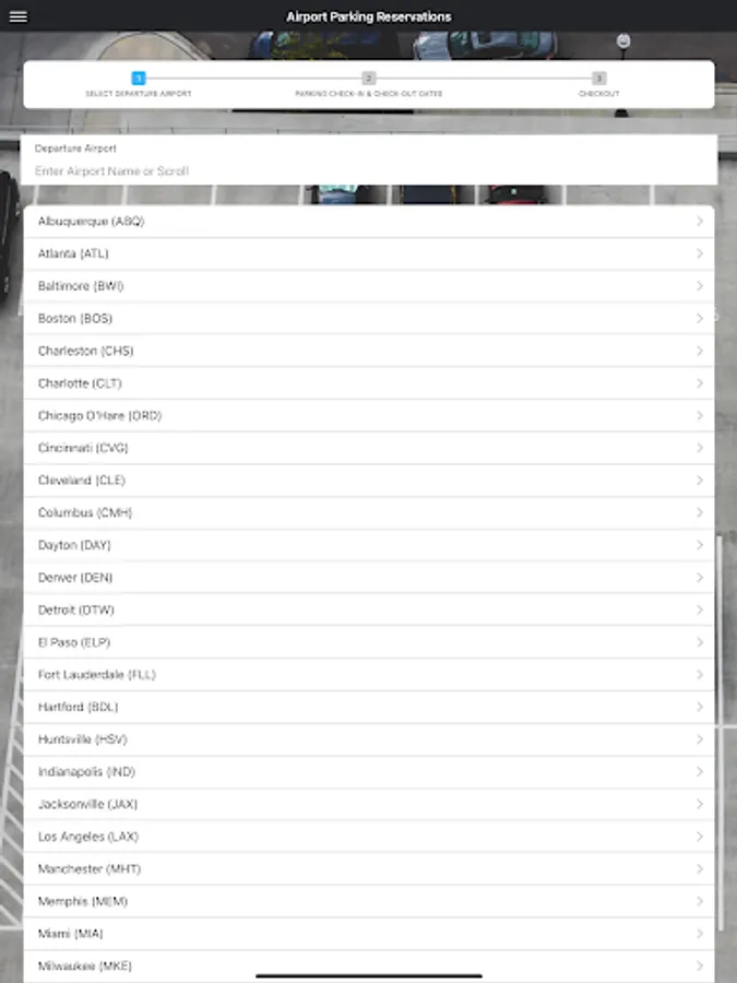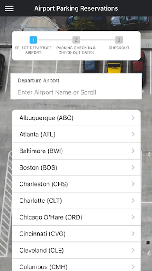 Select your airport of departure, enter your parking dates, and click SEARCH. The next page will display a list of lots in that area. You can click on the name of each facility to see a summary page that includes hours of operation, shuttle frequency, and other helpful information.