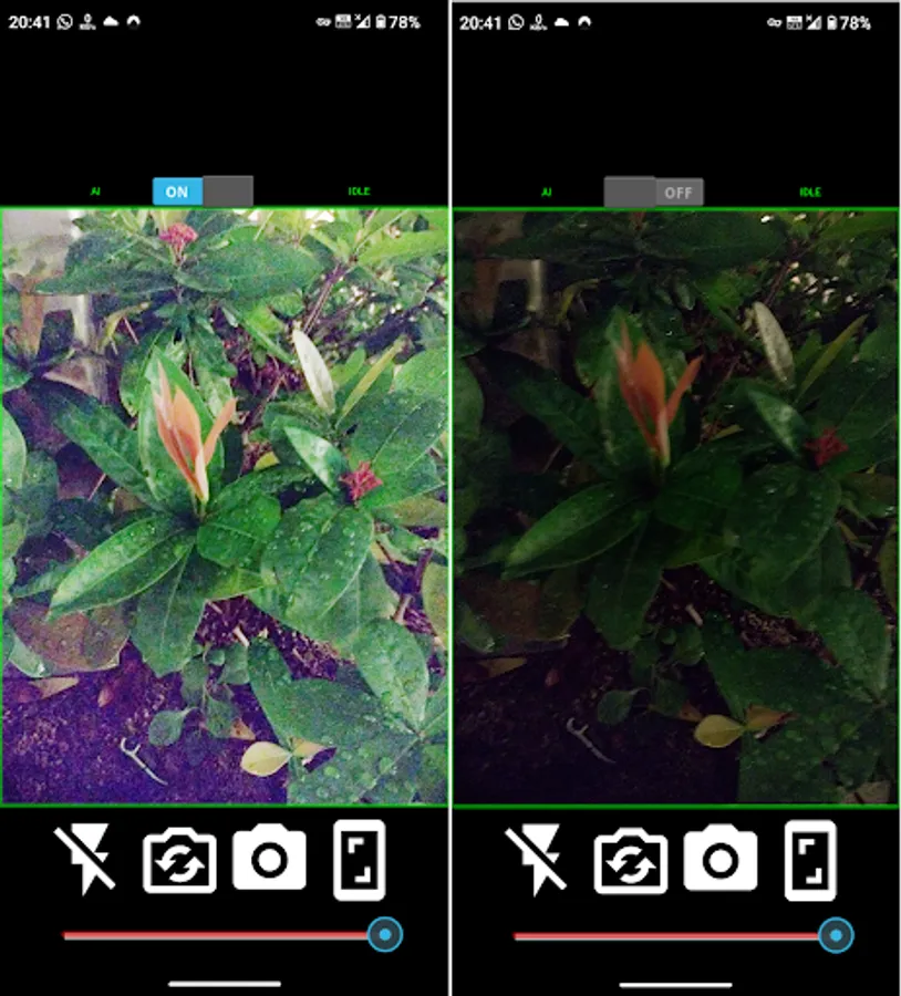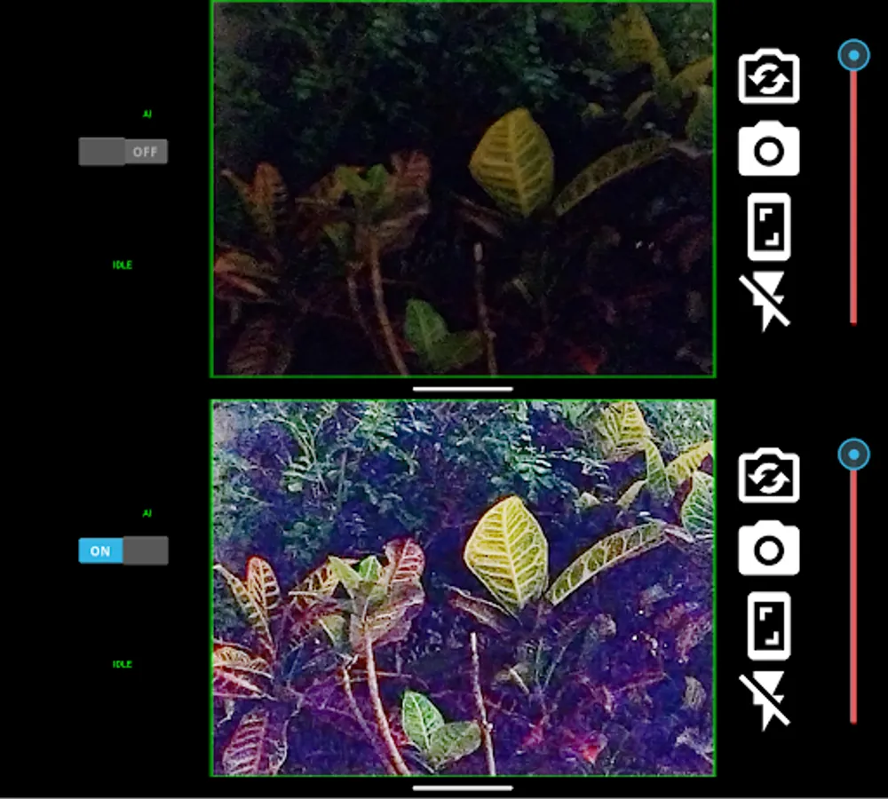 Camera Shooting with Light Enhancement AI. The app is designed for low light (or lowlight) environment photography. Under sufficient lighting conditions, the app utilizes TensorFlow AI models to enhance the lighting for photo taking.