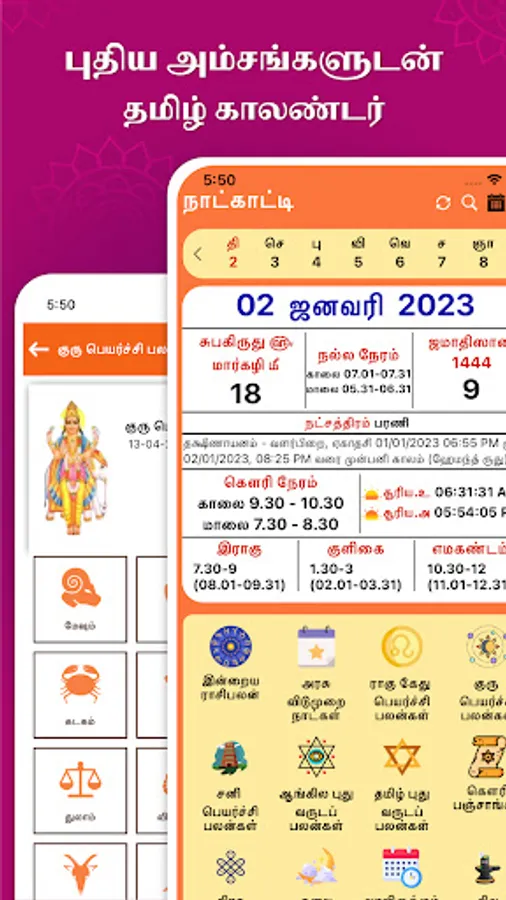 Tamil Calendar 2023 is a renowned offline Tamil calendar app with no complicated features and unnecessary permissions. The app displays the daily and monthly view of the Tamil Calendar. The daily view of the calendar contains information about auspicious times, nalla neram, gowri nall neram, raagu kalam, thithi, yogam, natchathiram, kuligai, muslim month and date, sun rising and setting time, daily rasi palan, festivals, siva thalangal, kanavu palangal, government holidays, and more. In addition, the app provides horoscope forecasts such as Tamil New Year Horoscope, English New Year Horoscope, Ragu-Kethu Peyarchi Palangal, Guru Peyarchi Forecast, etc.