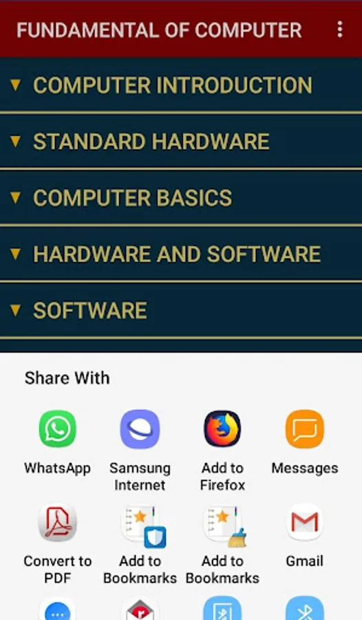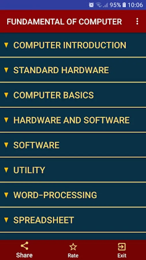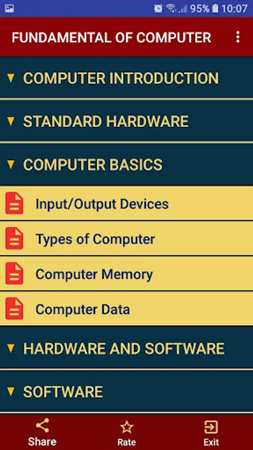 This TUTORIAL App includes all topics of Computer fundamentals such as input devices, output devices, memory, CPU, motherboard, computer network, virus, software, hardware etc.