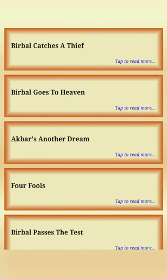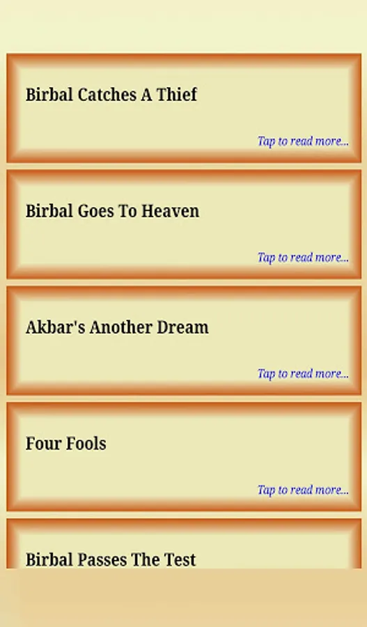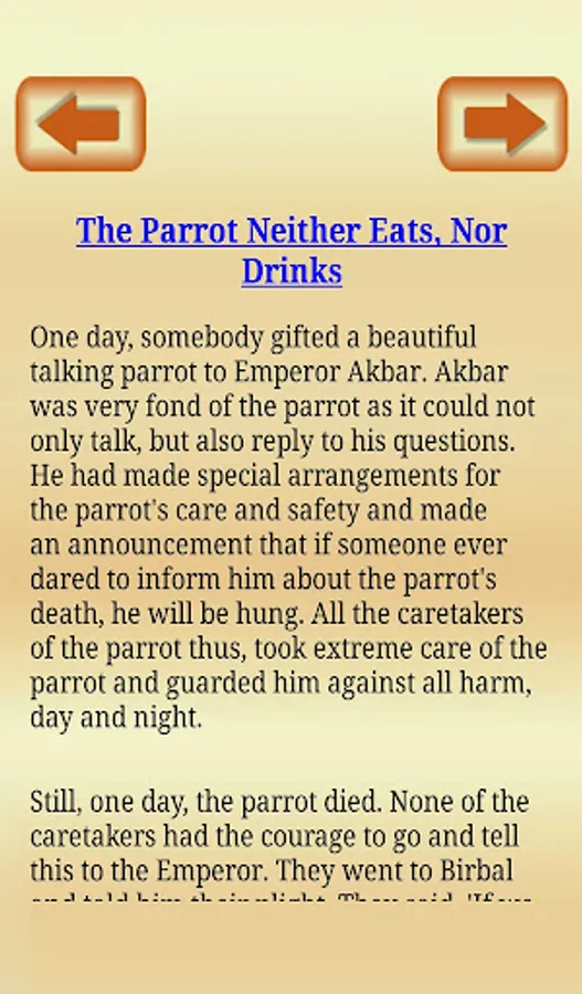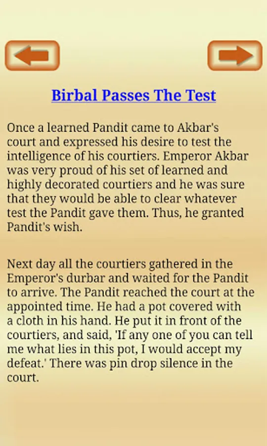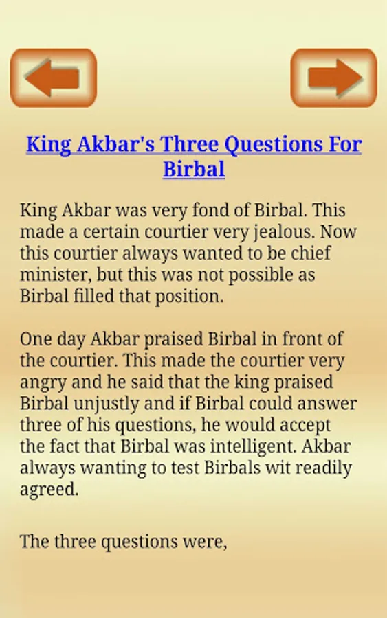 Birbal (1528-1586) original name Mahesh Das Bhatt was prime minister of Akbar. He was one of the nine advisers and most responsible member. He was the first person after Akbar who accepted religion - Deen-E-Elahi. Birbal was famous for his presence of mind and his intelligence. Akbar and Birbal stories are very famous for their moral wit and intelligence. Akbar was the king and Birbal was his courts-man. Birbal was witty and Akbar depended on him for tough decisions. These court stories later became famous Akbar and Birbal stories. These stories are collected and inculcated in this app so that user can read these age old stories and get good moral out of it. These stories are good read for all age groups. These humors and stories about Birbal were famous in kids and adults both. These stories are inspiring and well suited for kids and all ages, alike. No need of internet connection required. You can read these stories in off line mode too.