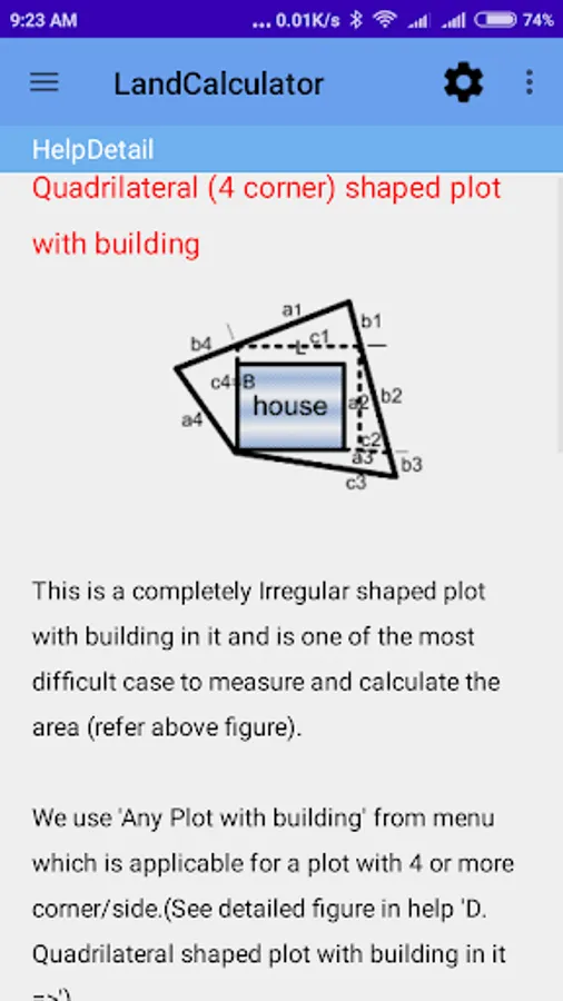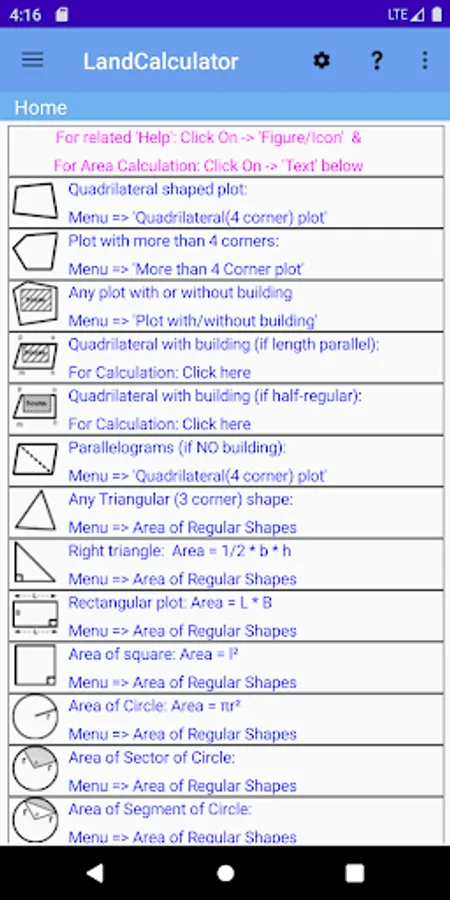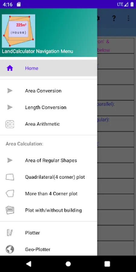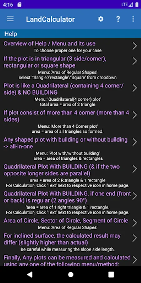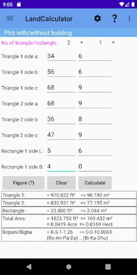 LandCalculator (Land Calculator) is an Android app to calculate area of a land/plots. It also provides some tips to convert an irregular shaped plot into regular shape and measure the land distances. LandCalculator is mainly applicable to calculate area using the traditional land measurement method, in which one has to form number of triangles & rectangles to convert the plot into number of regular shapes and perform various calculations to find area of each figure and for total area. This app will do all such calculations and gives area of each individual figure as well as total area in different units with a single click.