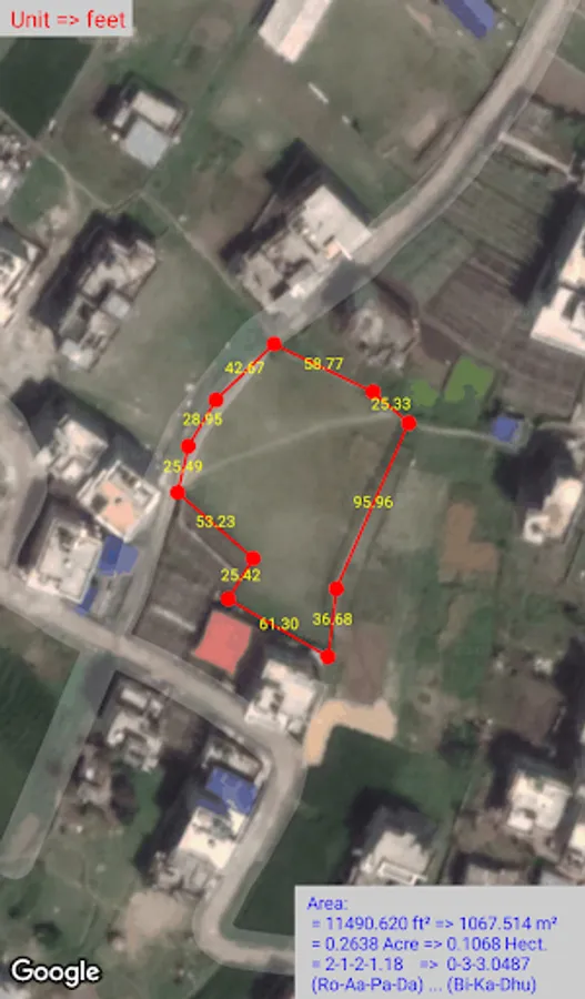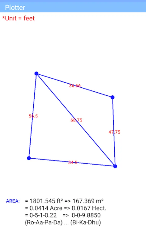 So you just measure the distances, LandCalculator will do all the calculations and provide area in different units like square feet, square meter, acres, hectare, ropani-aana-paisa-daam and bigha-kattha-dhur.