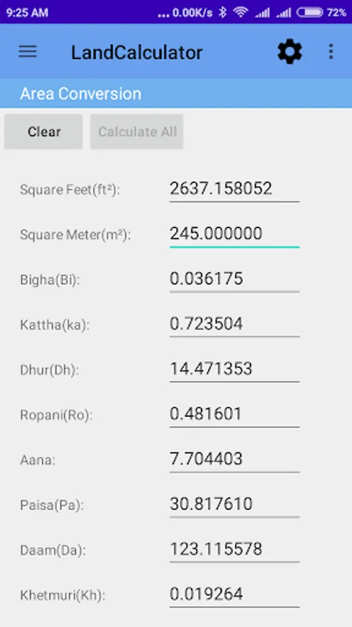 - Calculated result in different units such as square feet, square meter, acres, hectare, ropani-aana-paisa-daam, bigha-kattha-dhur etc.