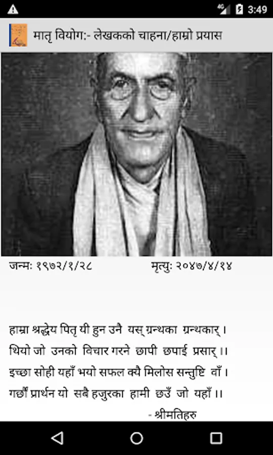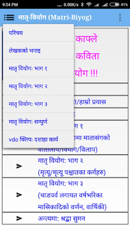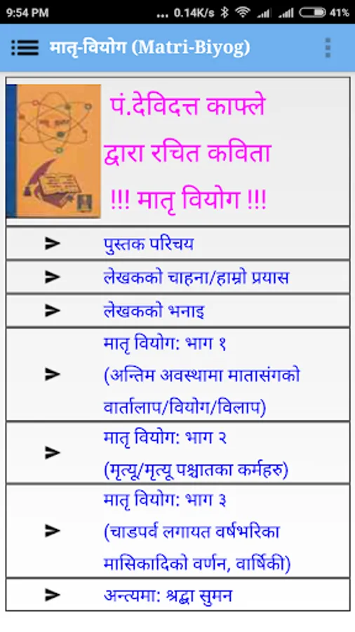 This is an android app containing Poem 'मातृ वियोग (Matri Biyog)' in Nepali language 'written by Pandit Devidatta Kafle in the Memory of his late mother.