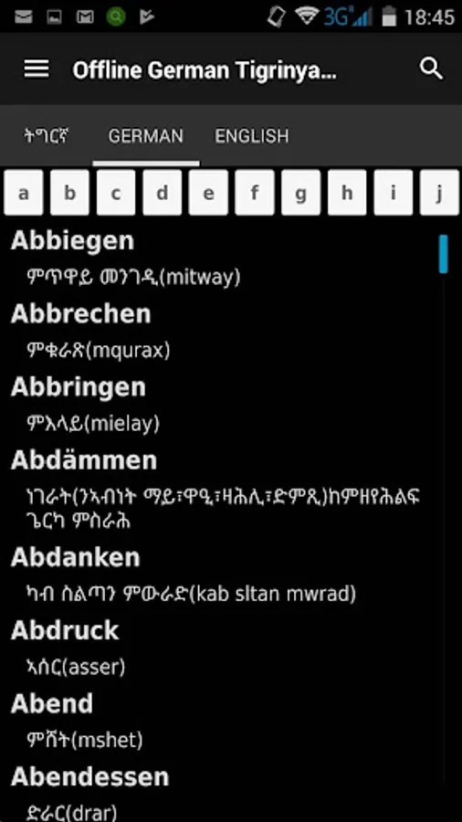 The new free dictionary "Offline German Tigrinya English Dictionary" enables quick translations of words, is easy to use and is suitable for beginners and advanced users.
