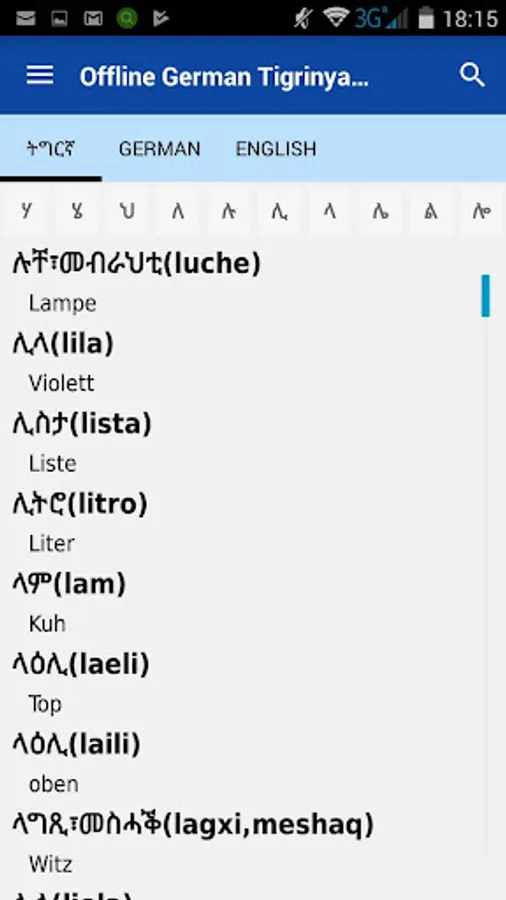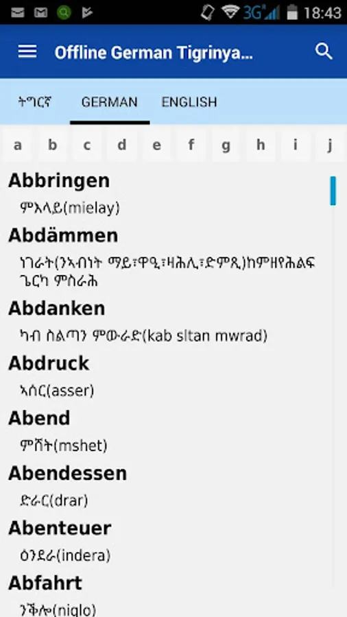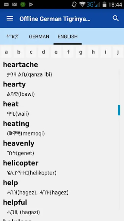 The new free dictionary "Offline German Tigrinya English Dictionary" enables fast translation of words, easy to use and ideal for beginners and advanced learners.