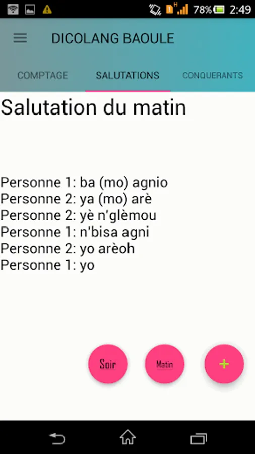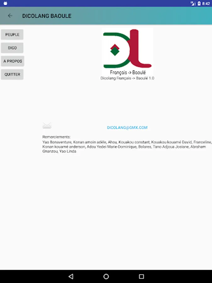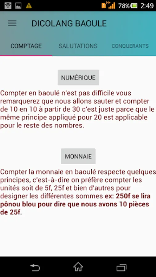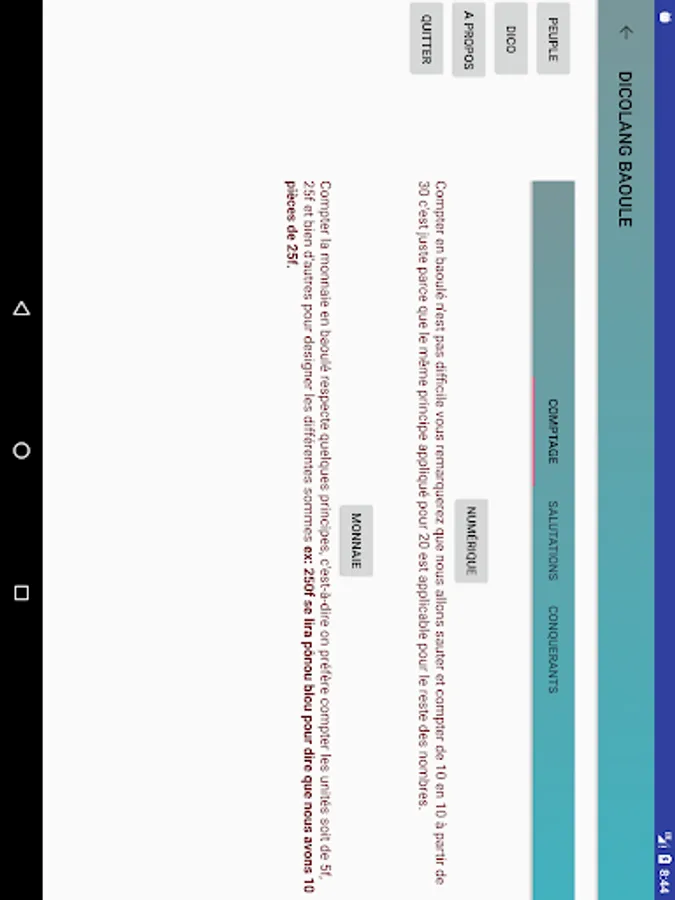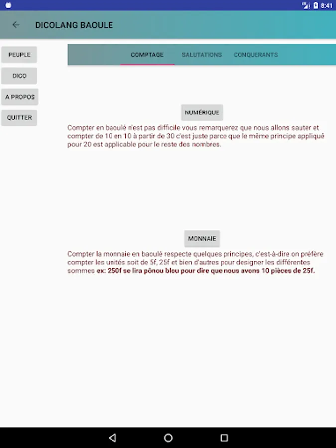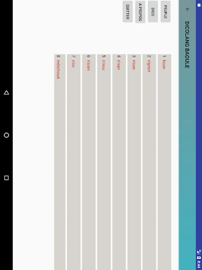 DicoLang your app that allows you to become familiar with the language Baule, which is one of the most spoken languages in Ivory Coast.