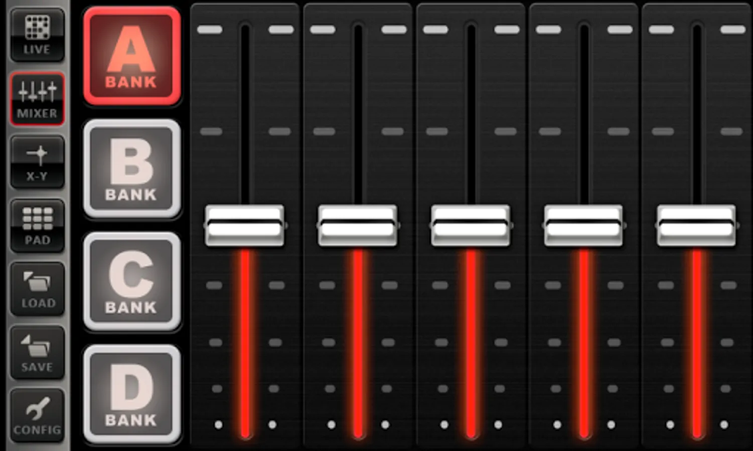 * Mixer with 4 banks of 5 faders.