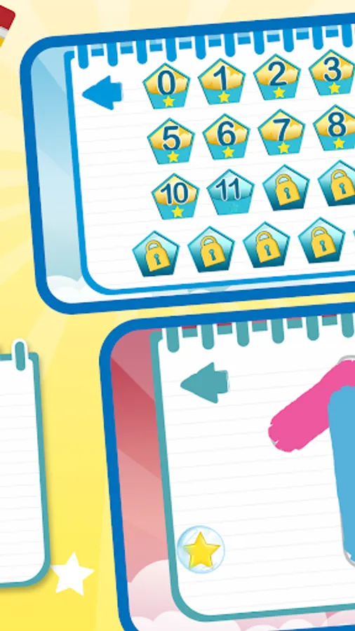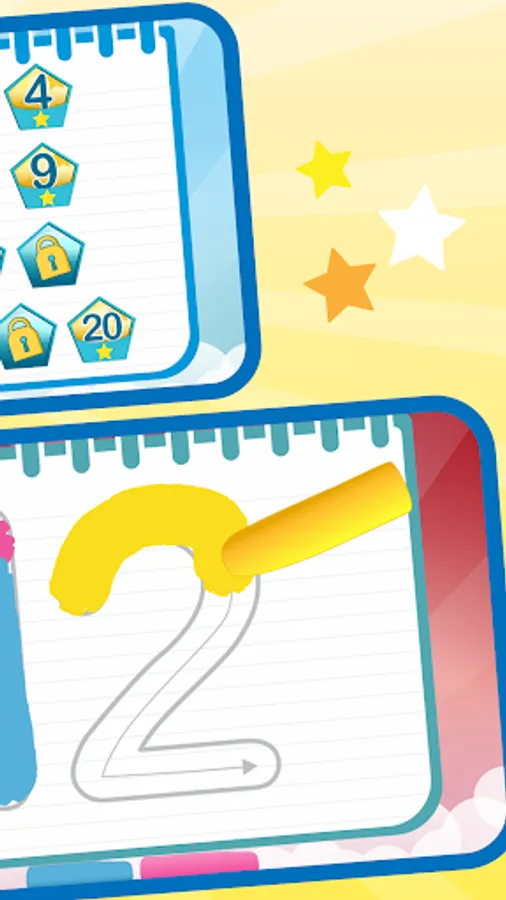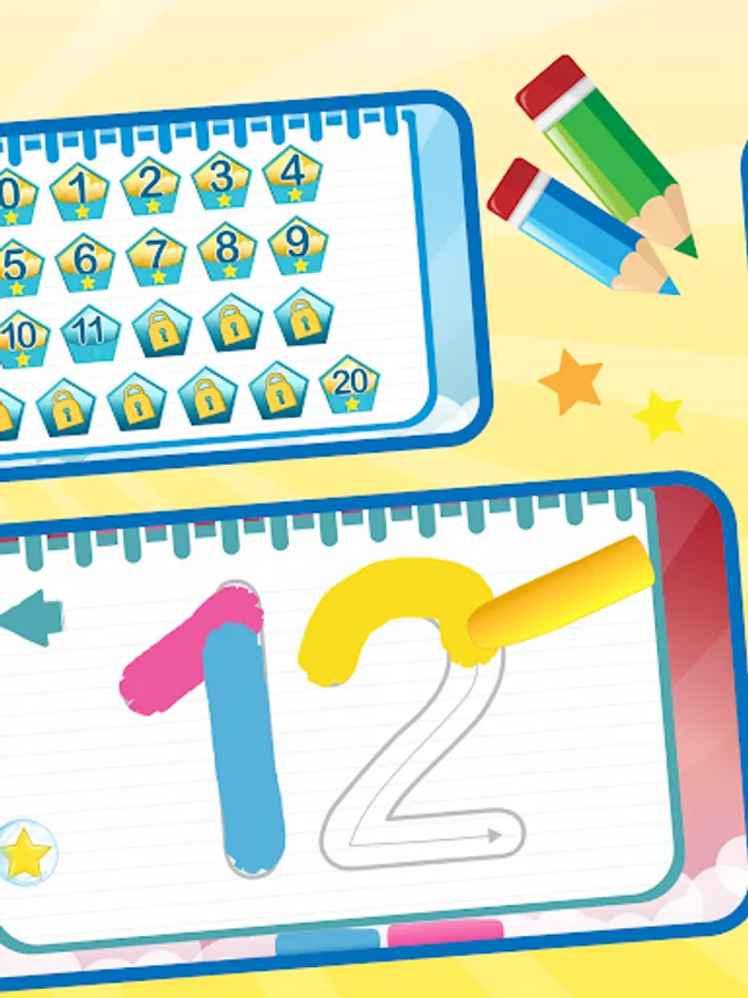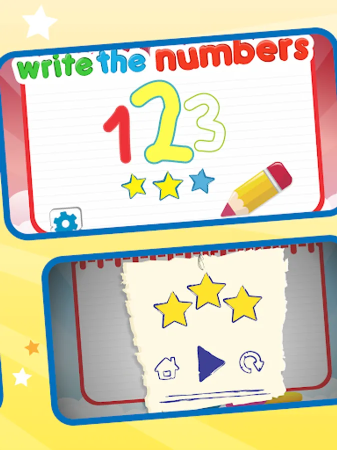 – Tracing numbers in the white paper with different colors where you are rewarded with 3 stars if you write the letter correctly, and in case of mistake you can use the eraser.