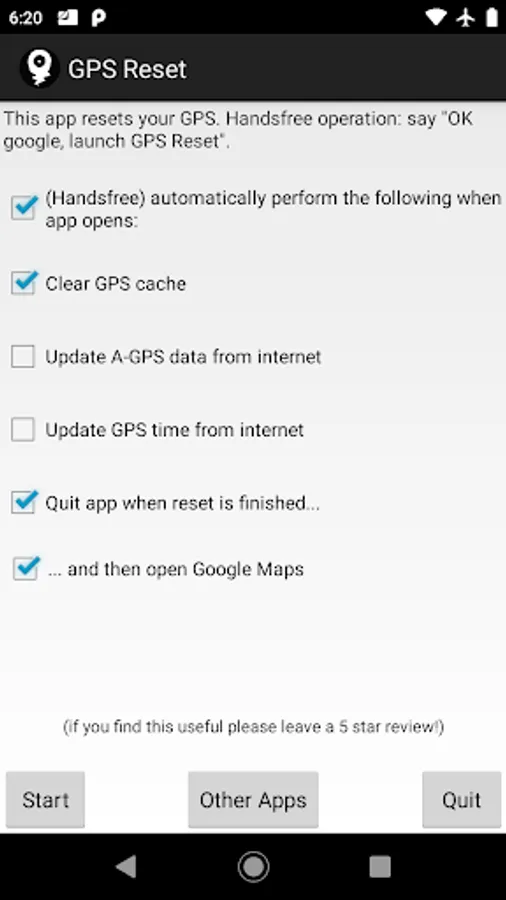 Optional Hands-Free mode: you can set the app to reset the GPS automatically when you launch it, which you can do by saying "OK google launch GPS Reset". So if your GPS goes haywire while driving you can fix it without touching your phone! I have used it successfully with my Samsung Galaxy S7 for exactly this problem.