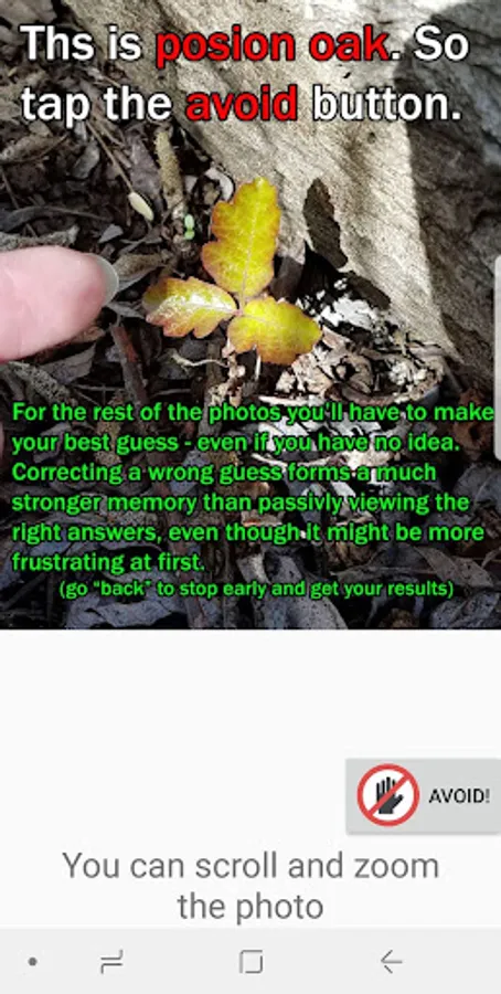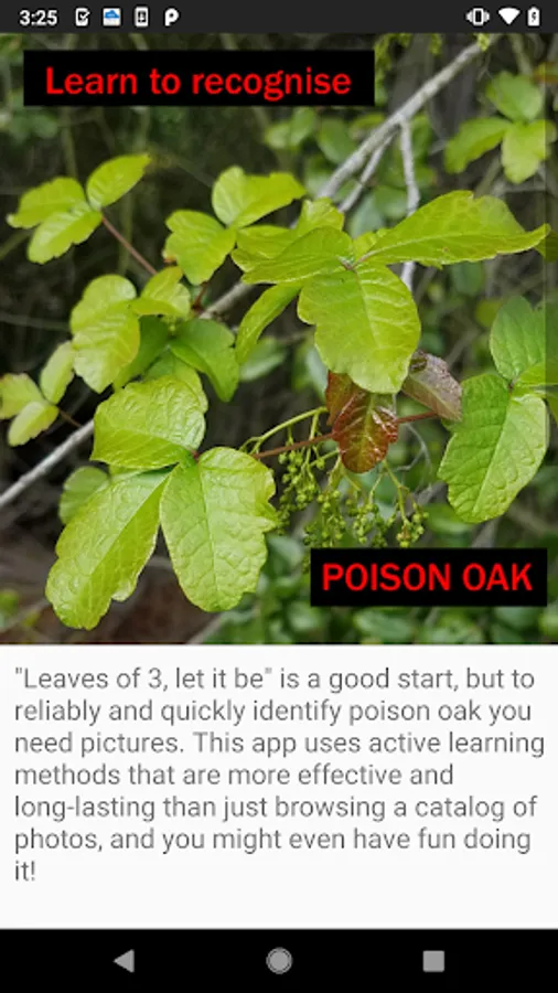 "Leaves of 3, let it be" is a good start, but to reliably and quickly identify poison oak you need images. This app teaches you to tell the difference between poison oak and other similar looking plants; at first you'll make mistakes, but you can repeat the training on all the examples you got wrong. This kind of active learning is much more effective then passively browsing a catalog of poison oak photos.