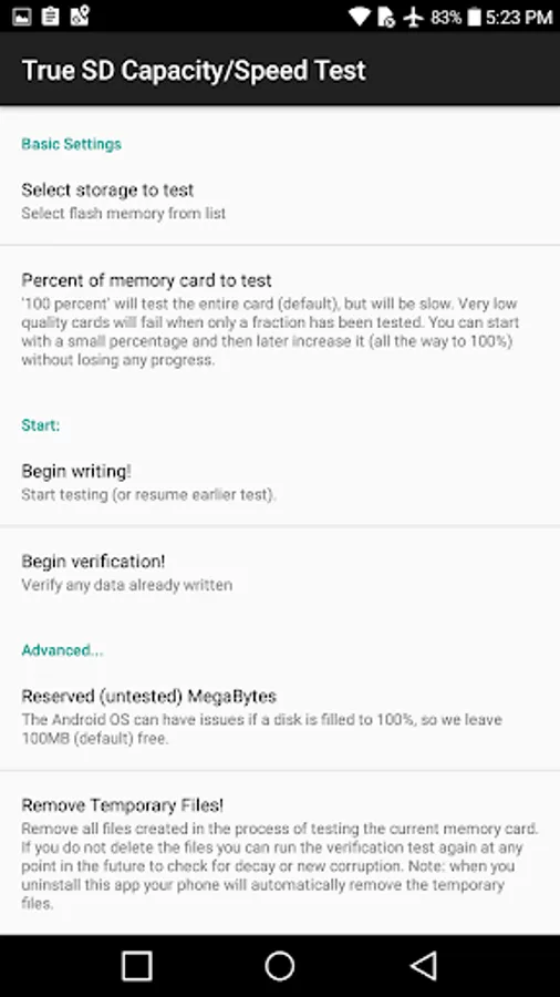 It's not the most pretty app because the focus has been instead on real-world testing and good algorithms. It is, however, easy enough to use. The only way to know your card is good is to fill it to the advertised capacity. Typically this takes less than an hour but can be longer if the card is particularly slow or enormous. Piece of mind is worth the wait and there are no shortcuts to it!