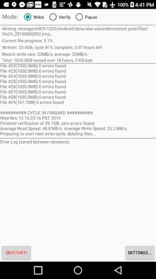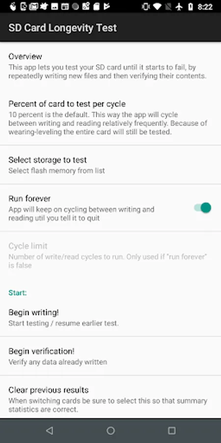 Tests microsd and/or internal memory for durability: how many writes can it survive before errors are detected? This is intended as an enterprise/development tool, with extra options and features; if you just want to test the SD card you just bought to make sure it's not fake, try our other cheaper app: "True SD capacity and speed test"