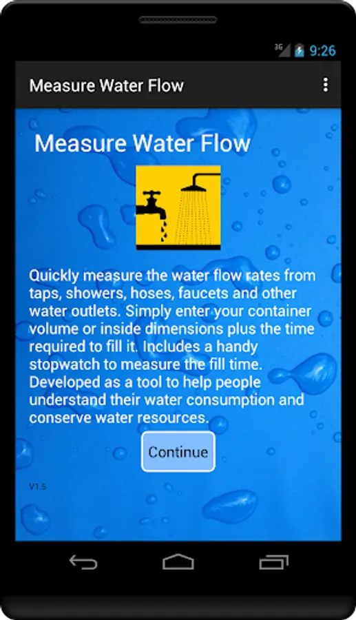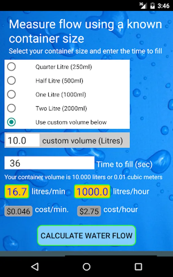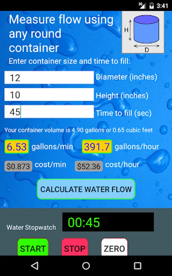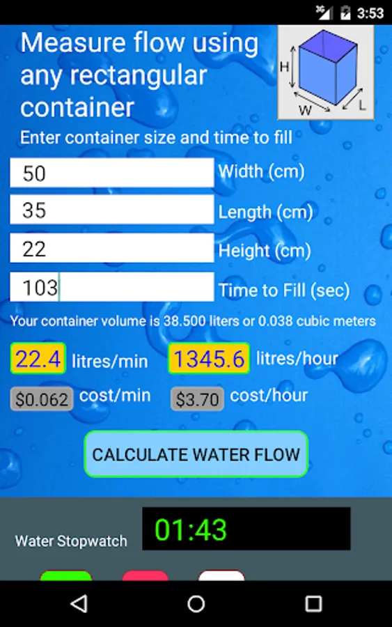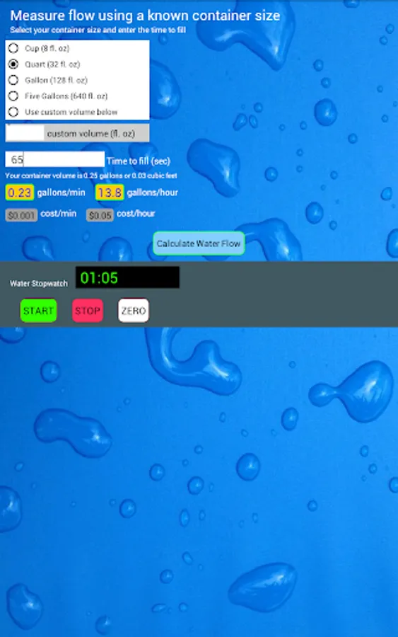 HOW IT WORKS: Place a container under your tap or water outlet to collect the water and use the app's built-in stopwatch to measure the time in seconds that it takes to fill. Enter the fill time and the app will calculate your water flow rate based on your container size and the time it took to fill. Very simple!