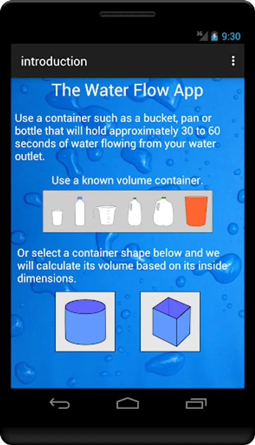 You can use any water container that you have on hand such as a bucket, bottle or can. If you do not know the container capacity, measure its inside dimensions and the app will calculate its capacity. For larger flows of water use a larger container. For very small flow rates and water leaks use a micro container such as a plastic bottle cap or a small cup. Choose a container size that will fill up in approximately 30-90 seconds.