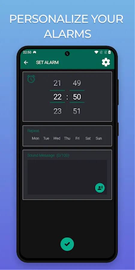For every Alarm created, you can set an exact time and day of the week. You are able to set your alarm sound message and repeat days for recurring events.