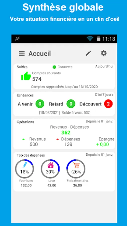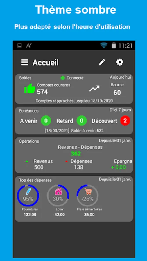 Unleash the full potential of this application with automatic bank synchronization from your banks (*), the AlauxSoft cloud (*) and widgets... Without the slightest effort your data is up to date, available on all your devices, allowing monitoring of your finances at a glance...