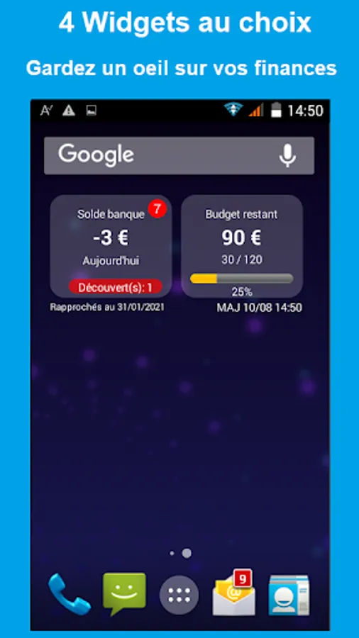 Keep an eye on your finances without having to start the App. Your finance summary will be available from your phone's home page and updated automatically (or on demand).