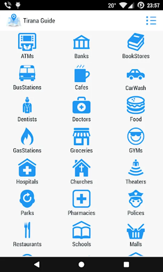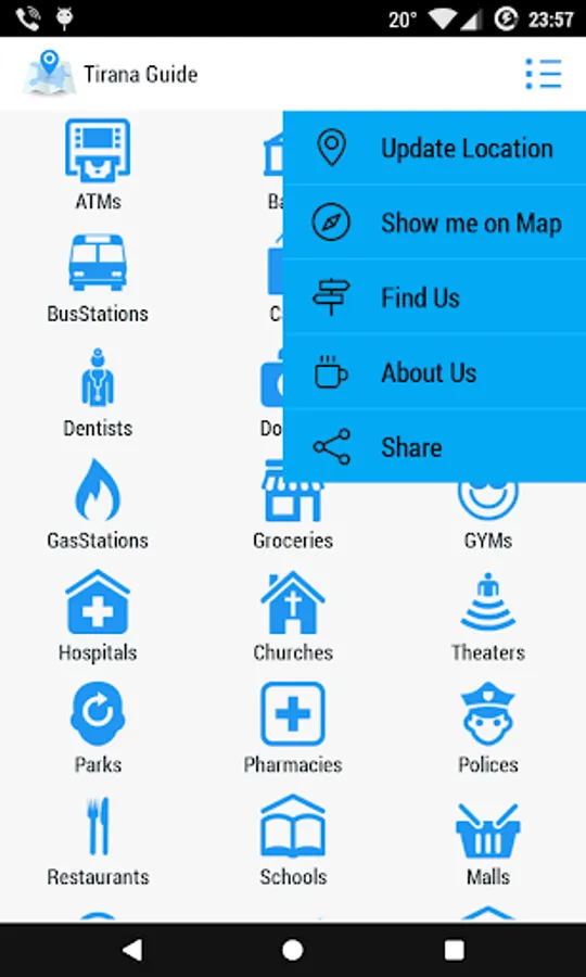 Tirana Guide is an android aplication based in goole places, this app it can help tourists to find ,banks, hotels,restaurants, locations, hospitals etc, everywhere in Tirana capital city of Albania.
