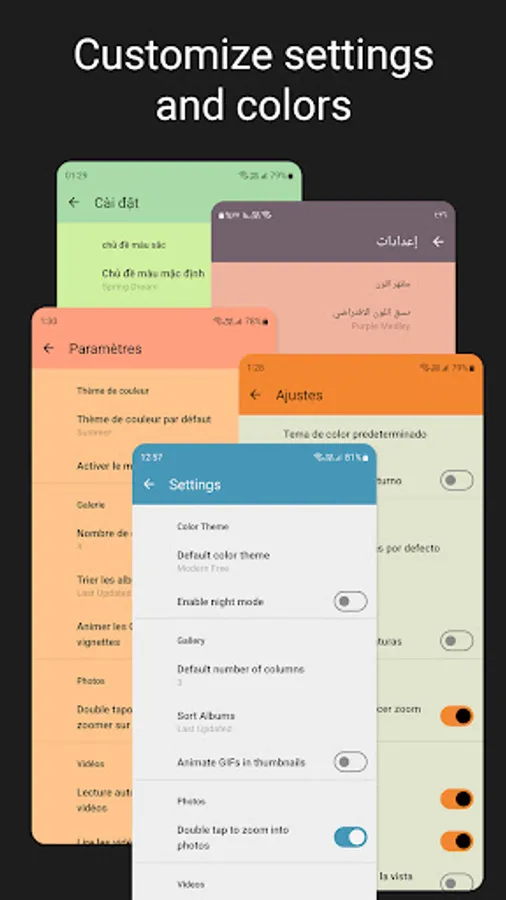 Look in the advanced settings for many options to configure. Customize the gallery, change the color theme or thumbnail size. The photo gallery app supports many languages including Spanish, Portuguese, Arabic, Chinese and more.