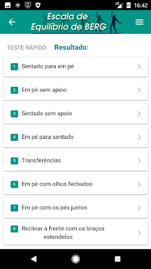 This application aims to facilitate the implementation of the Berg Balance Scale. The professional can assess balance and functional mobility of the individual, just with a touch on the tested item, the calculus is done automatically as the tasks are performed.