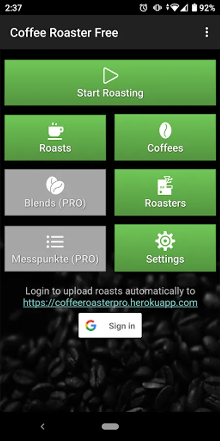 Just login with your Google login and your roasts are automatically uploaded to https://coffeeroasterpro.herokuapp.com. Afterwards you can download the roasts via "Download roasts" (menu main screen) in the PRO app.