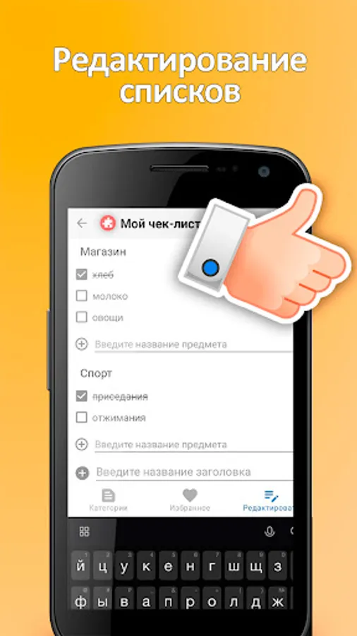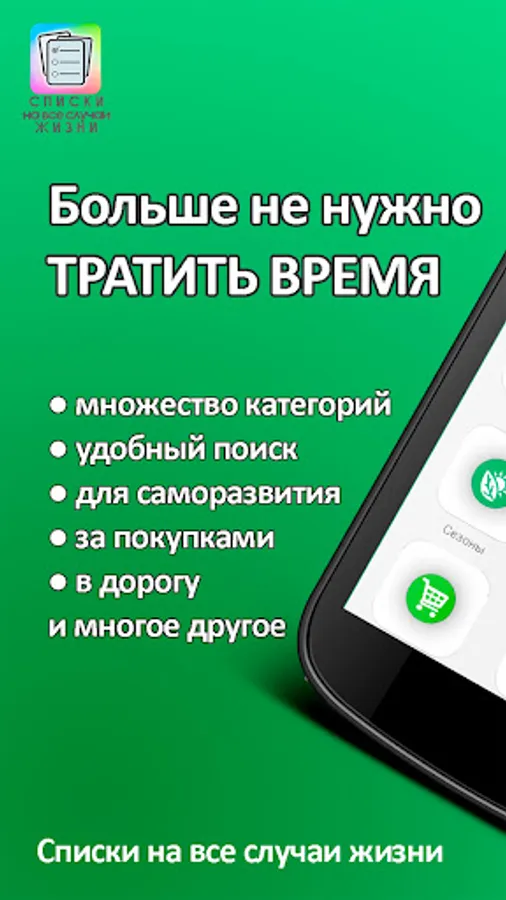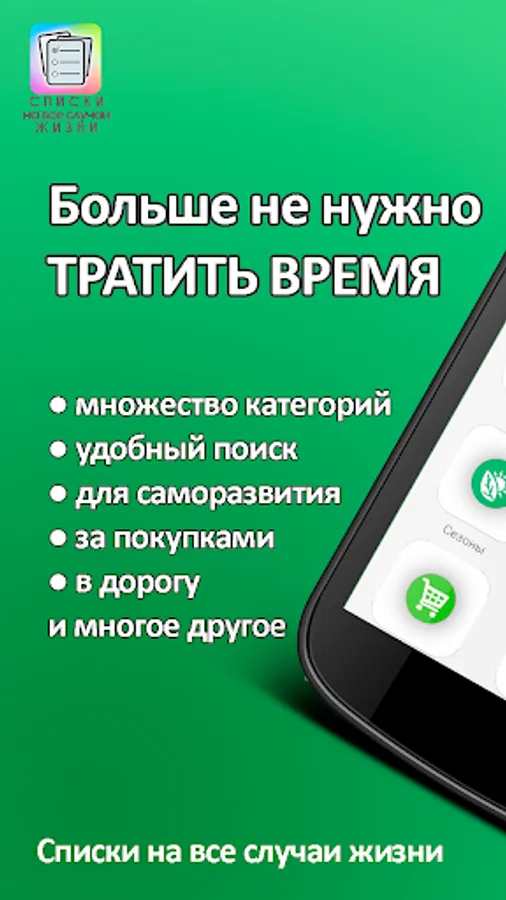 This application will save your time and creativity for more interesting activities. It contains more than 100 ready-made lists for all occasions. In addition, you can easily create your own lists and edit existing ones. In addition to the standard household lists, the application contains many lists for self-development, inspiration and entertainment.