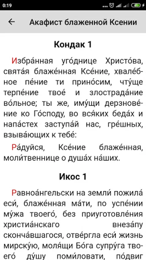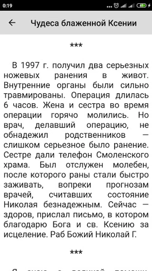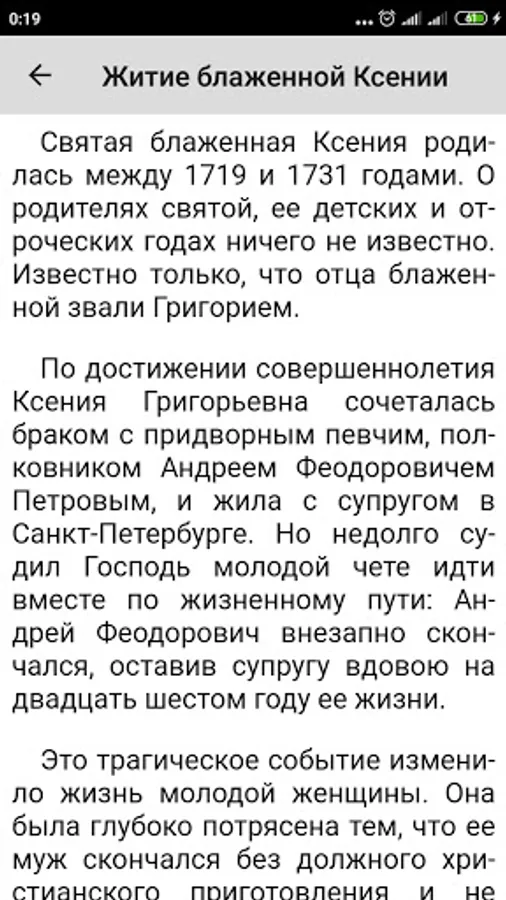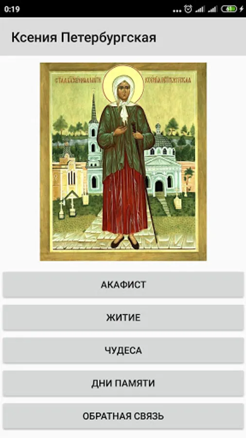 The application contains an akathist and a life with miracles of blessed Xenia of Petersburg. Blessed Xenia of Petersburg is the Guardian Angel of Petersburg, a beloved and widely revered Saint, who from the age of 26 to 71 wandered around the city without a roof over her head, helping people, praying for the salvation of the soul of her husband, who died without repentance due to sudden death.