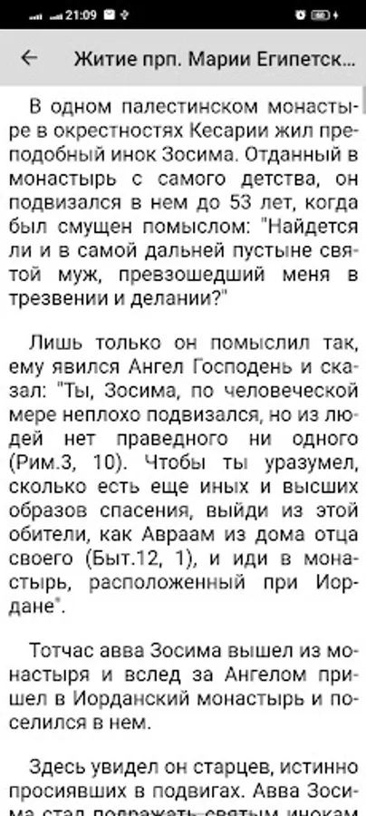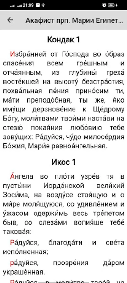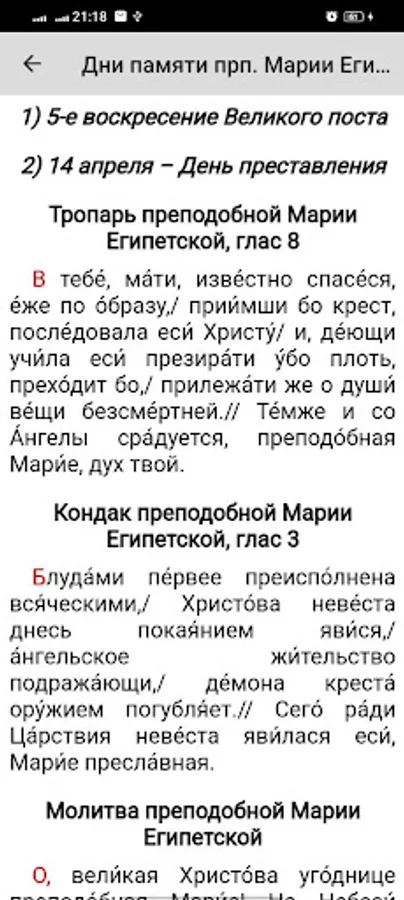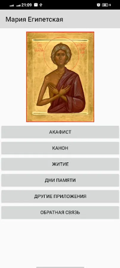 The application contains an akathist, a canon and the life of St. Mary of Egypt.