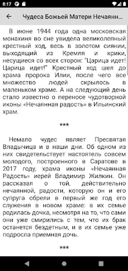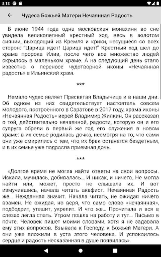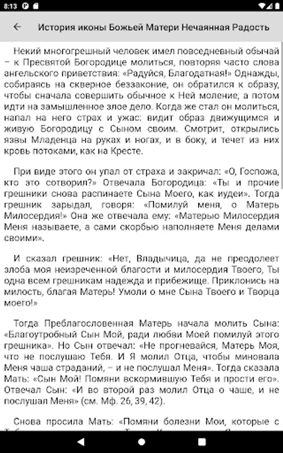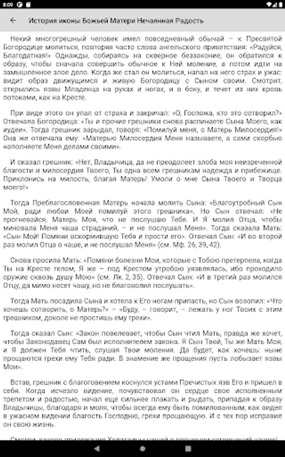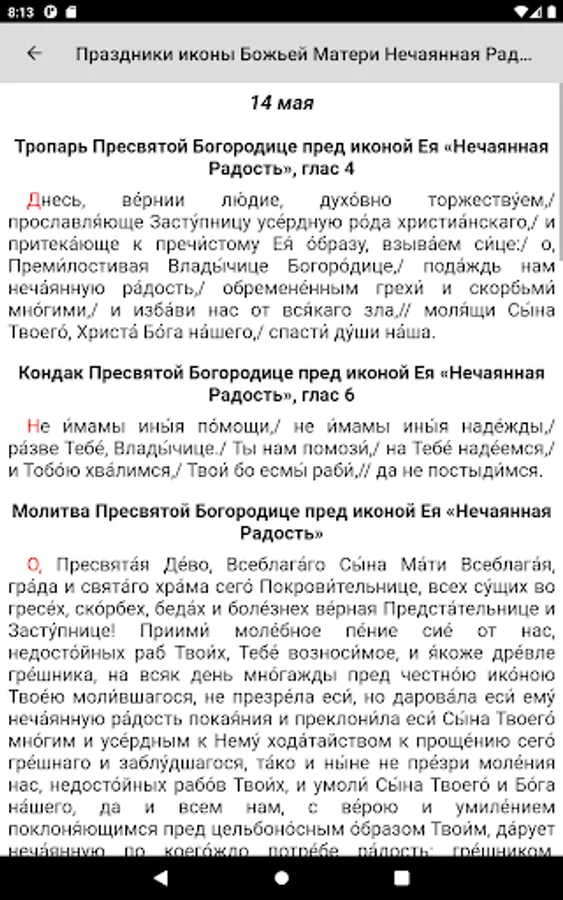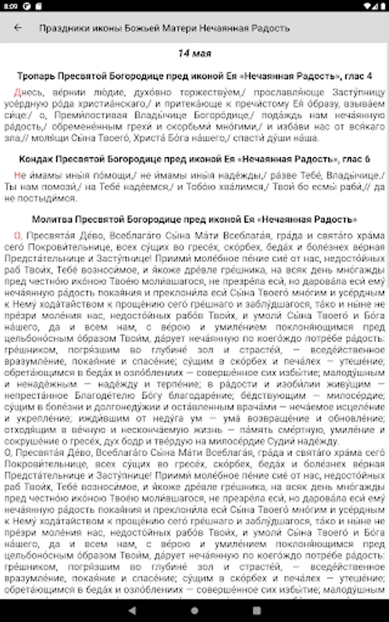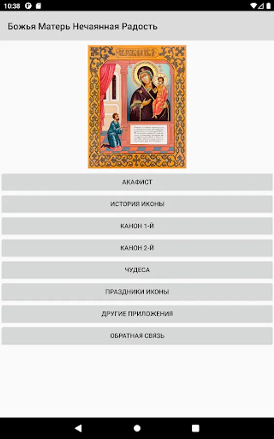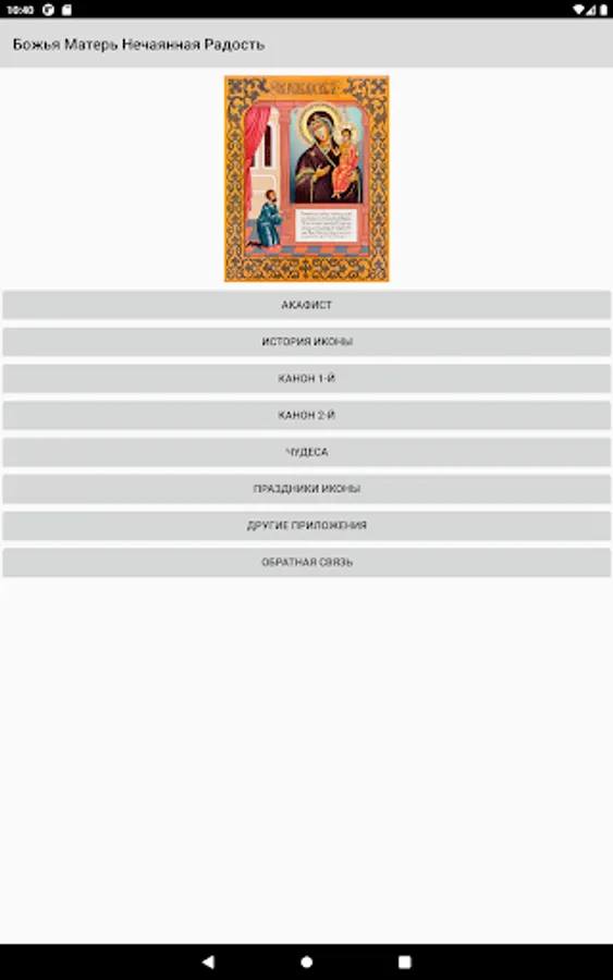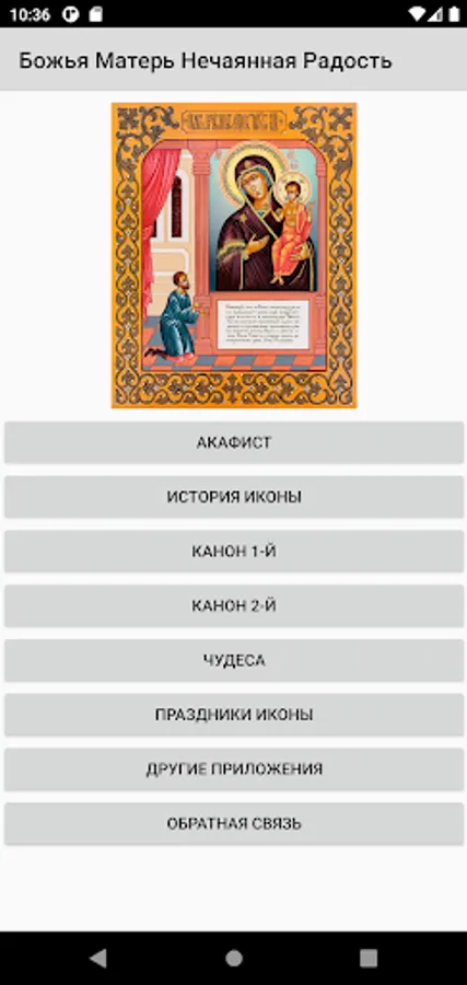 The application is dedicated to the icon of the Mother of God Unexpected Joy. In it you will find an akathist, canons, history and miracles through prayers to the Mother of God Unexpected Joy.