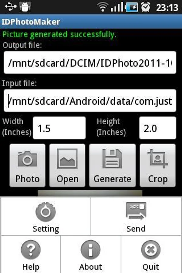 A Send option allows sending the generated picture via email/messaging/bluetooth.
