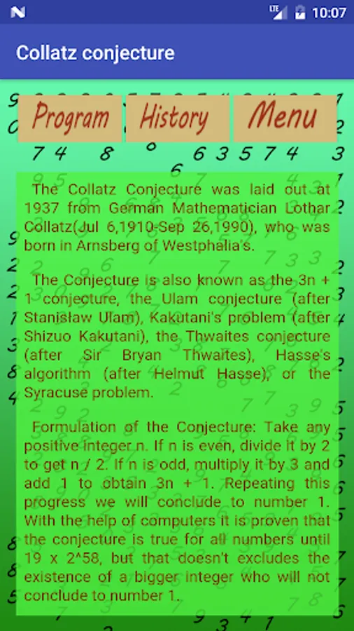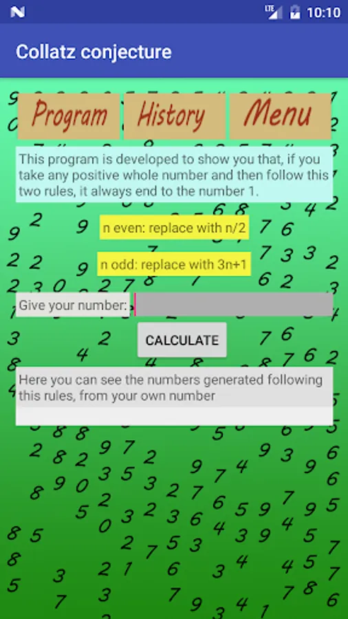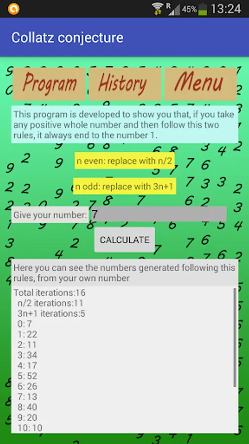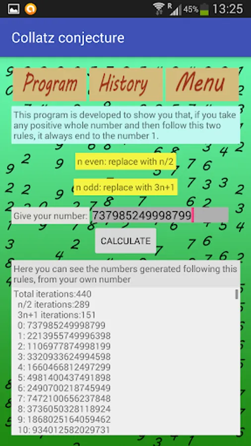 So with the help of this app you can calculate the sequence generated following this two rules and the number of iterations needed to reach the number 1.