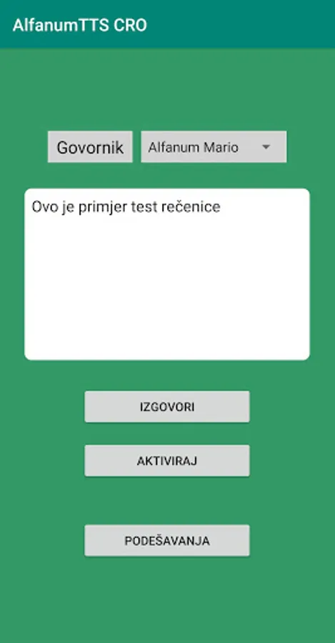Speech synthesizer for the Croatian language. It registers at the level of the Android operating system, so it can be easily used from any application. Just select AlfanumTTS CRO in the settings. Two speakers, male and female, were supported.