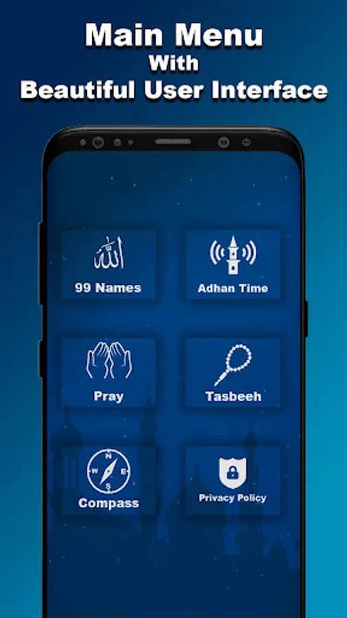 ✓ Qibla finder with Beautiful 99 names of Allah in Arabic and english Mp3 audio