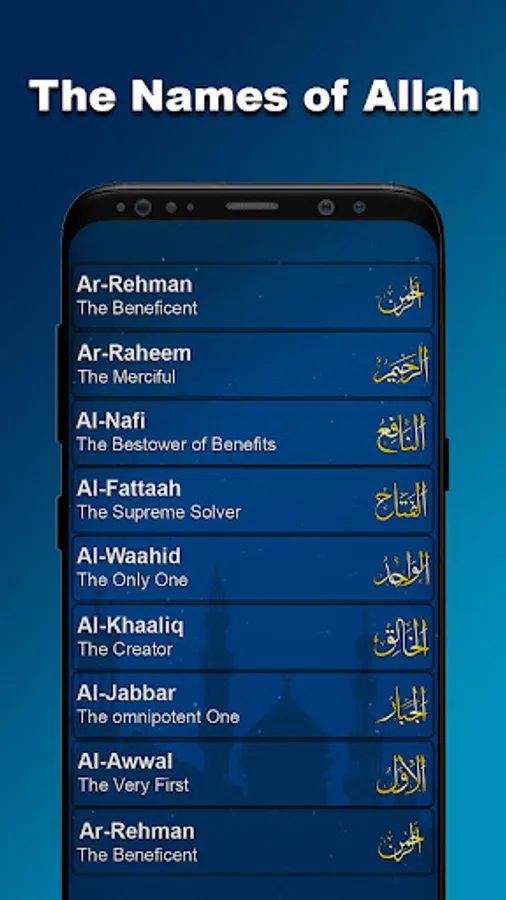 The 99 names of Allah are written in Arabic Also meanings of each name and audio according to the names plays Asma ul Husna, 99 names of Allah the beautiful Gloriuos 99 names and attributes of Allah SWT with english translation and detailed deccription. 99 Names of Allah app consist of perfect Audio and beautiful Allah names. Recite 99 names of Allah any time with beautiful audio voice Memorize in heart the 99 names of Allah with meaning and translation of each name of Allah.