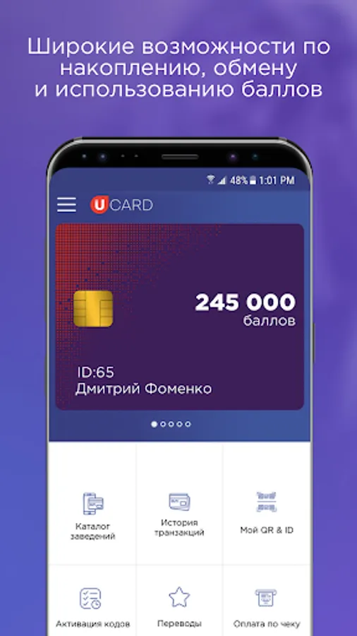 • Identify your personal ID number that is assigned when registering on the mobile app and you will instantly be credited bonuses (the percentage return of the check amount, which is set in front of each partner). The same thing you're doing when you pay the bill, saying that pay points UCARD, will name your ID and you will be billed for the check, which you need to confirm;